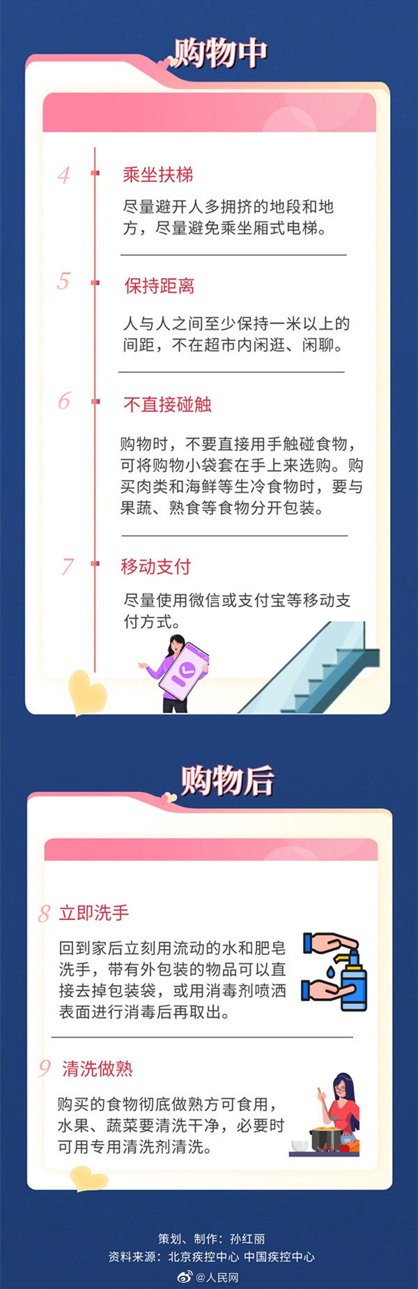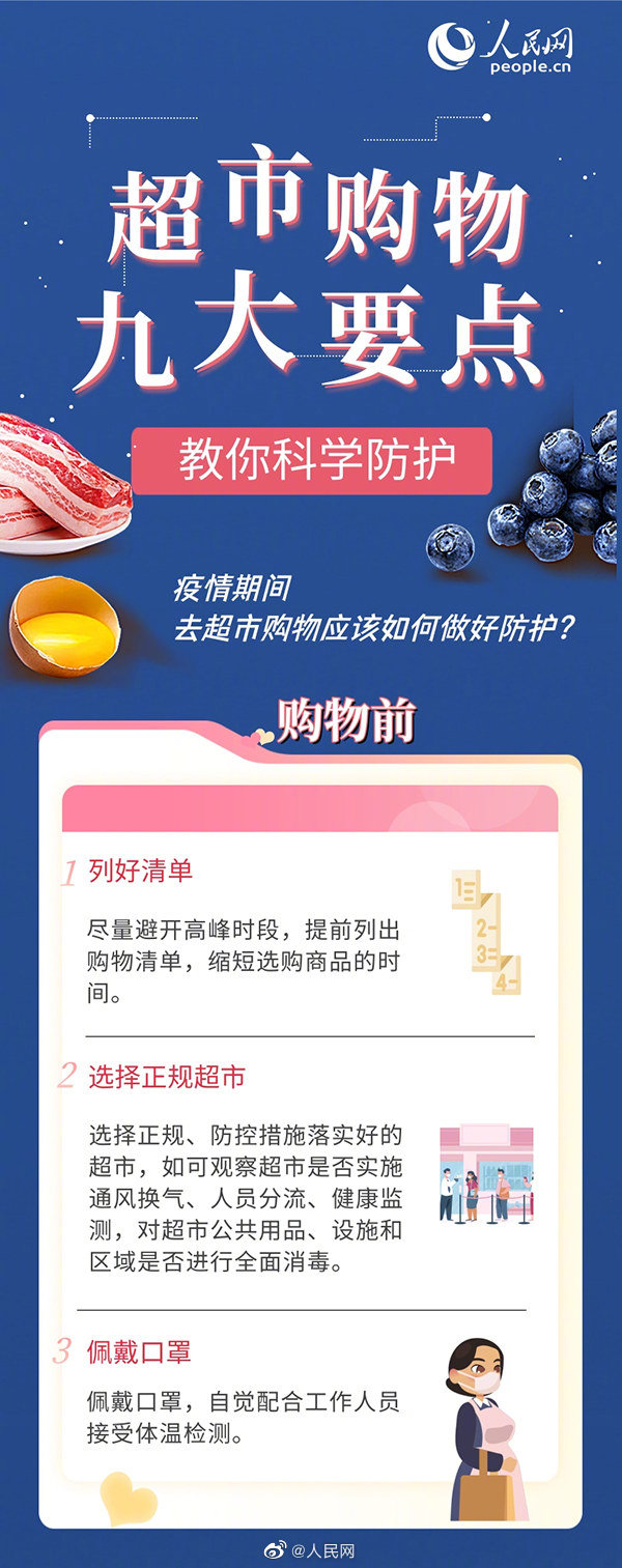 9个要点教你科学防护:①列好清单;②选择正规超市;③佩戴口罩;④乘坐扶梯;⑤保持距离;⑥不直接触碰;⑦移动支付;⑧立即洗手;⑨清洗做熟。(人民网)