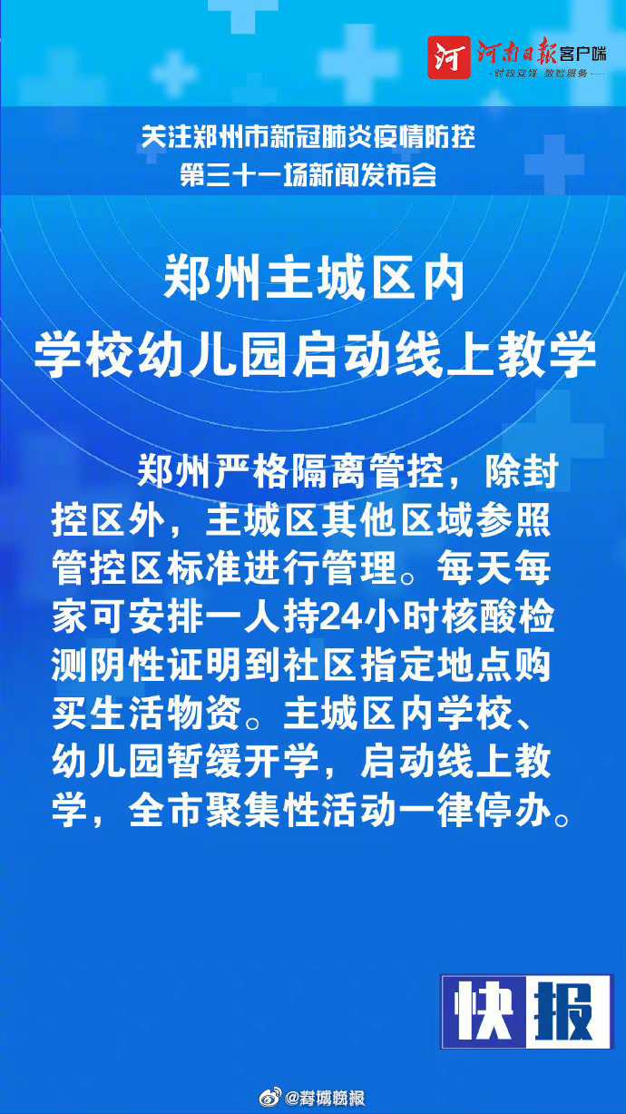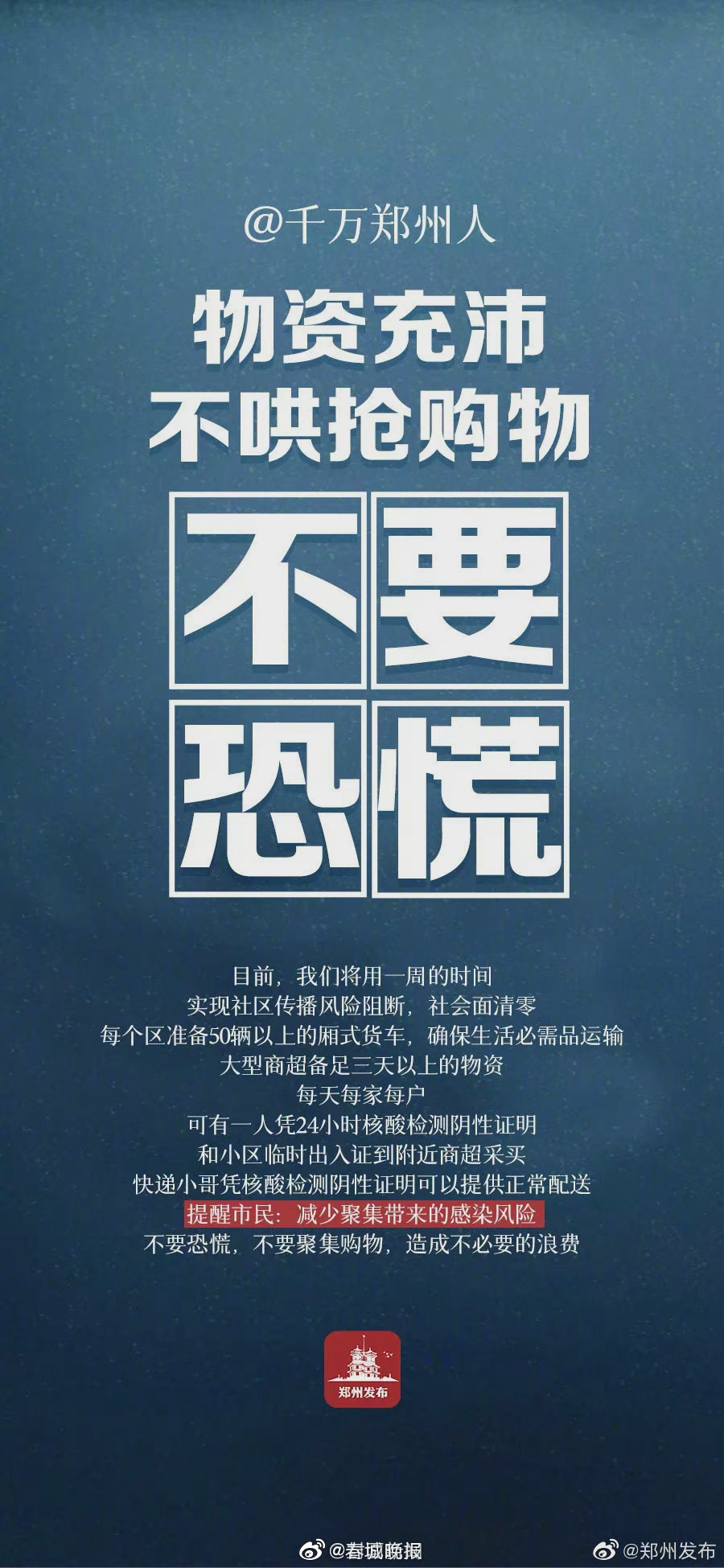 郑州全市人员非必要不离郑5月3日,郑州市新冠肺炎疫情防控指挥部新闻发布会消息,4月30日至今,通过核酸检测发现的郑东新区高铁站工作人员传播链,目前基本判定为省外确诊病例在高铁东站中转时传播所致。同时,郑州市今天进行的8个主城区全员核酸检测,完成采样729.93万人,已出结果221.5万人,初筛阳性2例、疑似阳性3管,目前正在复核中。从流调排查及人员分布情况看,病例涉及活动场所较多,人员构成复杂,存在一定的社区传播和疫情外溢风险。据@郑州发布 消息:我们将用一周的时间,实现社区传播风险阻断,社会面清零。每个区准备50辆以上的厢式货车,确保生活必需品运输;大型商超备足三天以上的物资,每天每家每户,可有一人凭24小时核酸检测阴性证明和小区临时出入证到附近商超采买,快递小哥凭核酸检测阴性证明可以提供正常配送。主城区内学校、幼儿园暂缓开学,启动线上教学,全市聚集性活动一律停办。提醒市民:减少聚集带来的感染风险,不要恐慌,不要聚集购物,造成不必要的浪费。(正观新闻)#郑州发布2022年73号通告##请郑州市民不要扎堆抢购##河南多地发布最新疫情防控提醒#