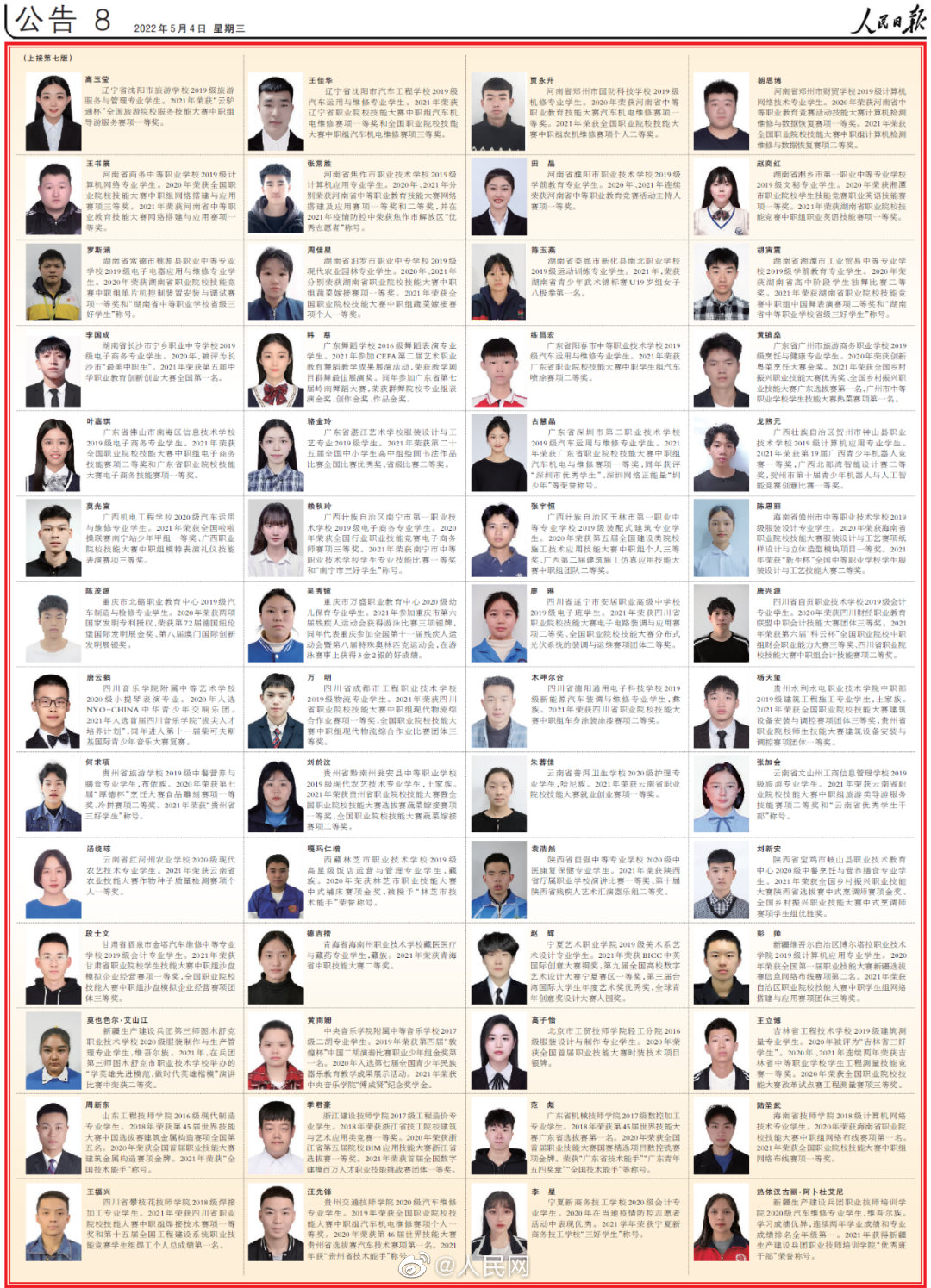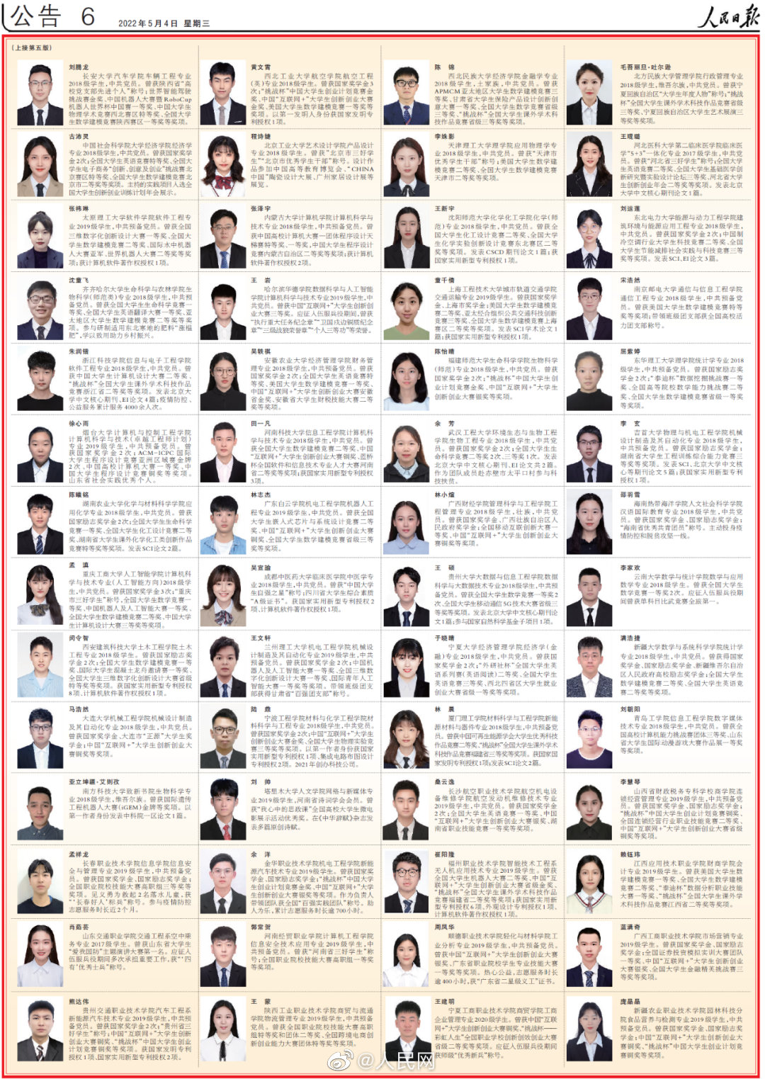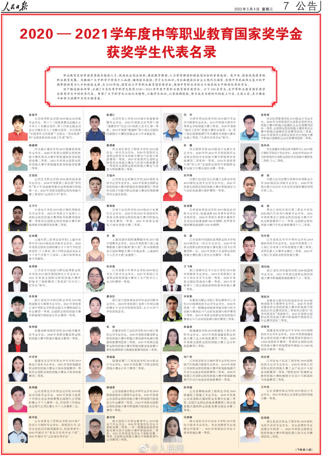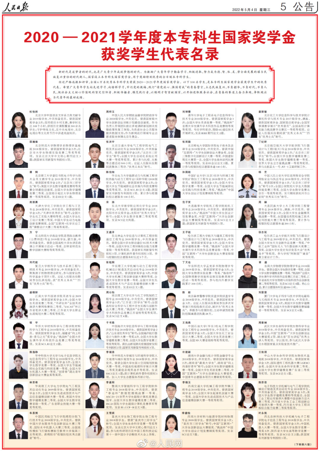 青春华章经过严格选拔和评审,全国6万名优秀本专科学生荣获2020—2021学年度国家奖学金,全国2万名优秀中职学生获得2020—2021学年度中等职业教育国家奖学金。5月4日出版的人民日报,用四个整版刊登了100名本专科生国家奖学金获奖学生优秀代表和100名中等职业教育国家奖学金获奖学生优秀代表名录↓↓