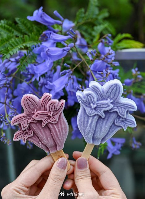 从最初的几株小苗,到如今蓝紫花海开遍全城,蓝花楹如散落的繁星一般,给5月的昆明染上迷人的色彩。近年来,每到蓝花楹“染紫”春城,不仅云南省内游客纷至沓来,很多省外游客也慕名而来。蓝花楹已经成为春城文旅的亮丽IP。如何将“IP+文化消费”落到实处,真正实现“文旅赋能”?2020年,讲武文创蓝花楹主题雪糕在昆明蓝花楹艺术节首次亮相,美丽灵动的花朵造型设计,近乎还原蓝花楹的色彩,加之细腻甜美的口感,引得市民争相购买,并作为特殊的道具拍照留念。(春城晚报-开屏新闻记者 颜媛)