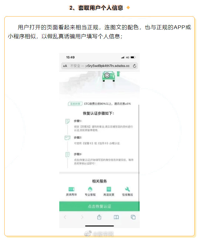 这些冒充ETC短信诈骗套路你了解吗?自ETC普及以来,各式各样的诈骗短信层出不穷,不法分子冒充“ETC中心”、“高速管理中心”、“交管局”等机构,通过发送短信“ETC过期认证、系统升级、失效激活”等内容,并附带业务办理的网页链接,诱骗用户点击链接。用户点击链接打开的页面与真实网站界面基本一致,但实则是“钓鱼网站”的页面,是专门欺骗用户或窃取访问者提交的账号和密码等私密信息的网站。今天,就来为大家分析下短信诈骗的通用套路。(互联网联合辟谣平台)