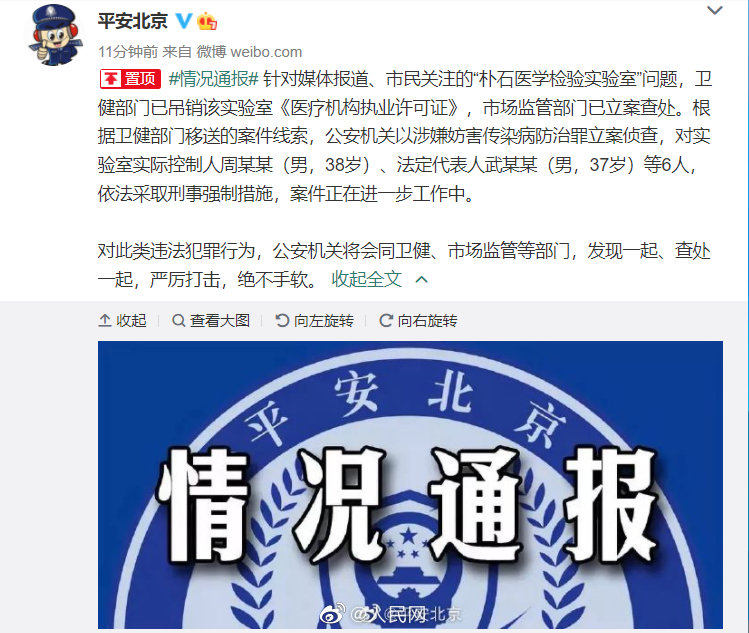 据@平安北京 ,针对媒体报道、市民关注的“朴石医学检验实验室”问题,卫健部门已吊销该实验室《医疗机构执业许可证》,市场监管部门已立案查处。根据卫健部门移送的案件线索,公安机关以涉嫌妨害传染病防治罪立案侦查,对实验室实际控制人周某某(男,38岁)、法定代表人武某某(男,37岁)等6人,依法采取刑事强制措施,案件正在进一步工作中。