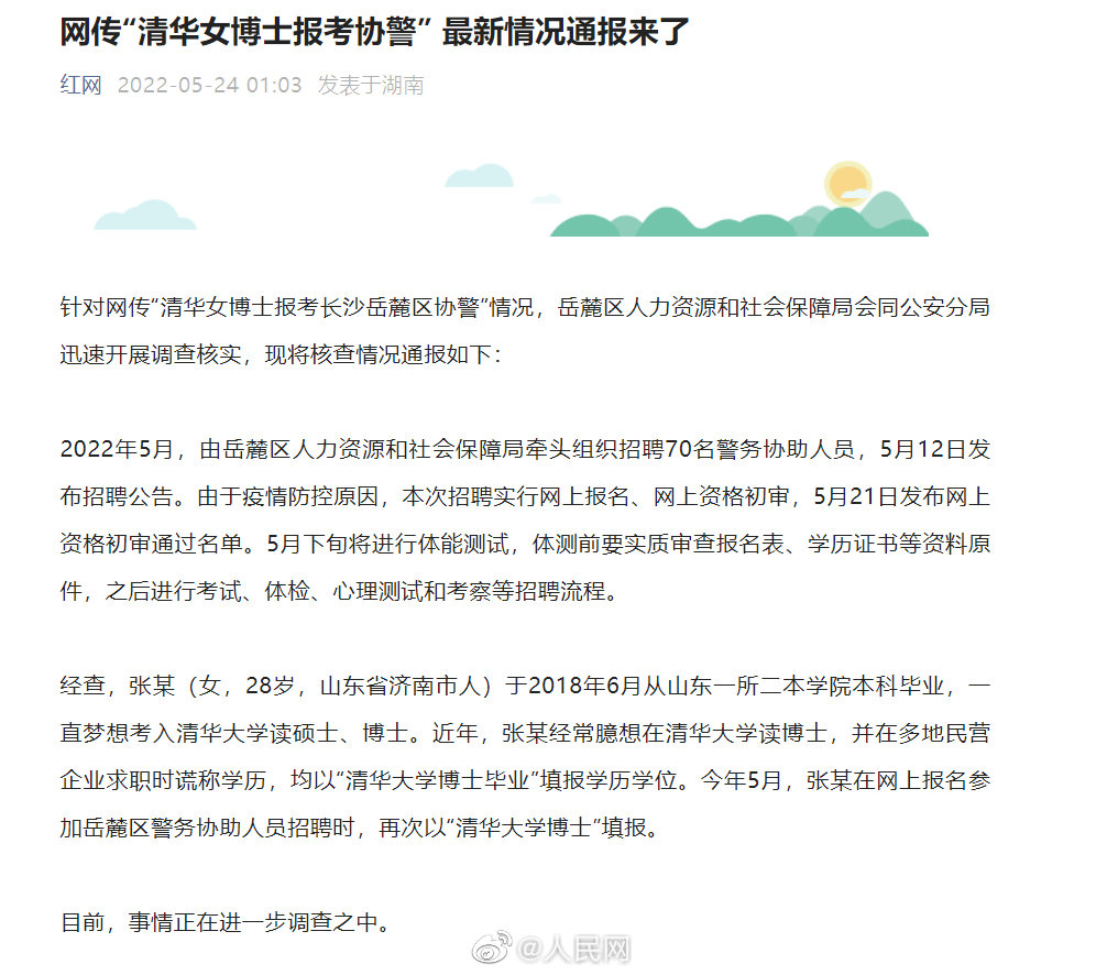 清华博士报考协警系谎报学历5月24日,长沙岳麓区人社局会同公安分局通报“清华女博士报考协警”一事:张某实为二本院校本科毕业,在多地民营企业求职时谎称学历...通报详情↓↓ (红网)