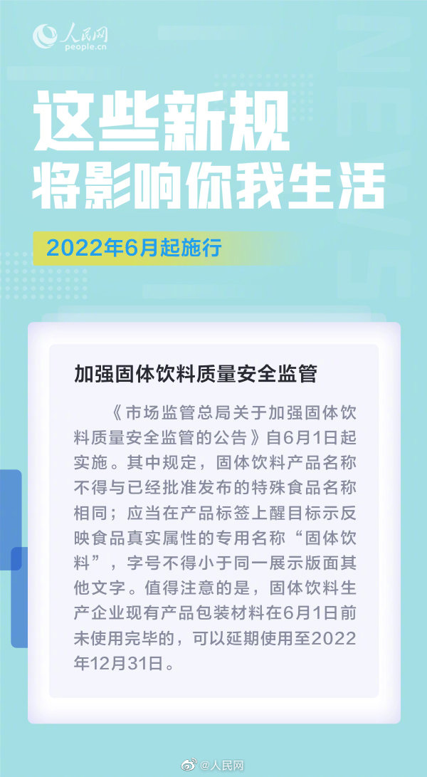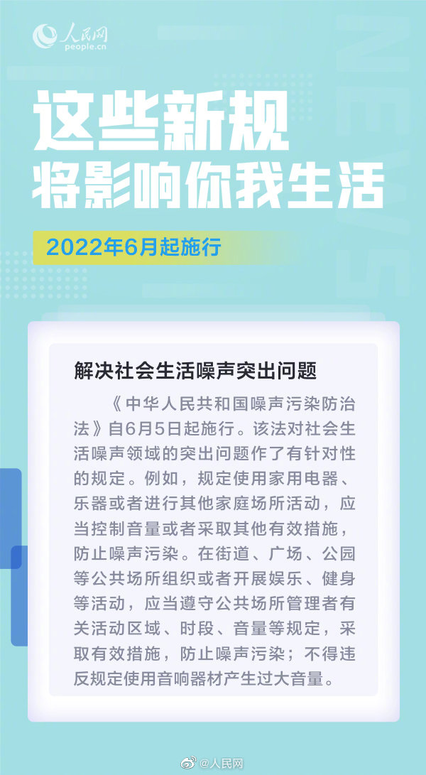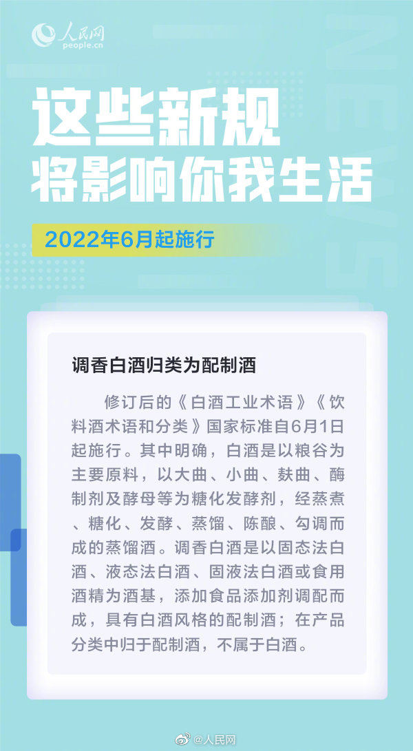 ①在公共场所组织或者开展娱乐、健身等活动,应当遵守公共场所管理者有关活动区域、时段、音量等规定,采取有效措施,防止噪声污染;②加强固体饮料质量安全监管;③#调香白酒归类为配制酒不属于白酒#……6月,这些新规实施,将影响你我生活↓↓(人民网)