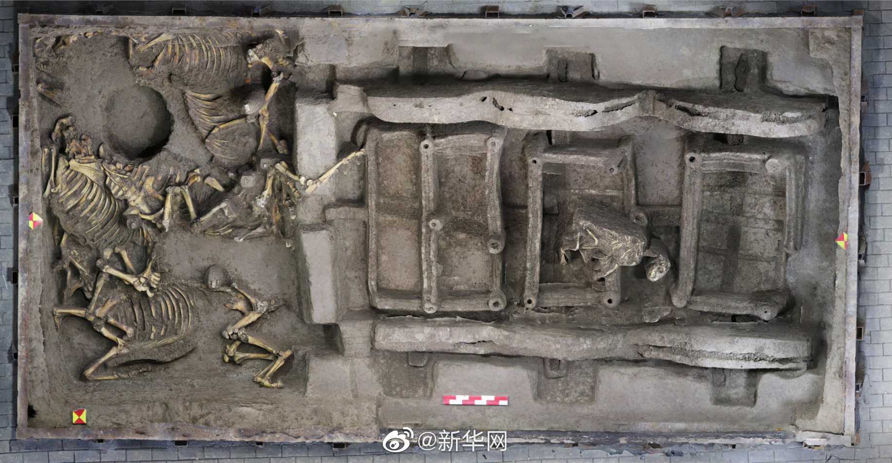 徐阳墓地考古发掘现场负责人马占山介绍,今年2月,M15陪葬车马坑的清理工作启动,这座车马坑由“马”区和“车”区两部分组成,马匹集中摆放在坑的北侧,马车集中摆放在坑的南侧。在“马”的身后,三驾呈南北竖向排列的马车已经显现,车辆轮廓清晰完整,最前面的马车体型较大,后面两辆马车体型相对较小。