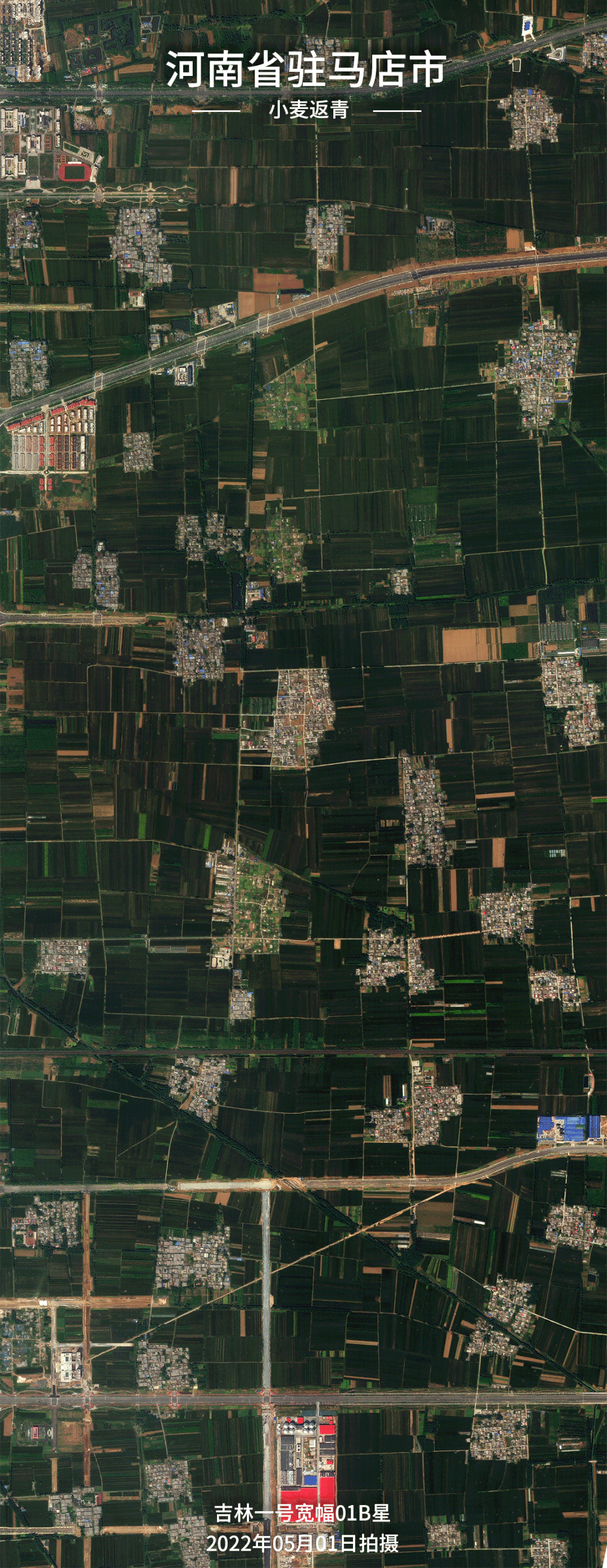 河南驻马店,千万亩小麦在五月由青色逐渐泛黄。太空俯瞰广袤的麦田,像一幅铺展开的金色油画,呈现出一派丰收在望的喜人景象。#从太空看中国麦田丰收画卷#(吉林一号)