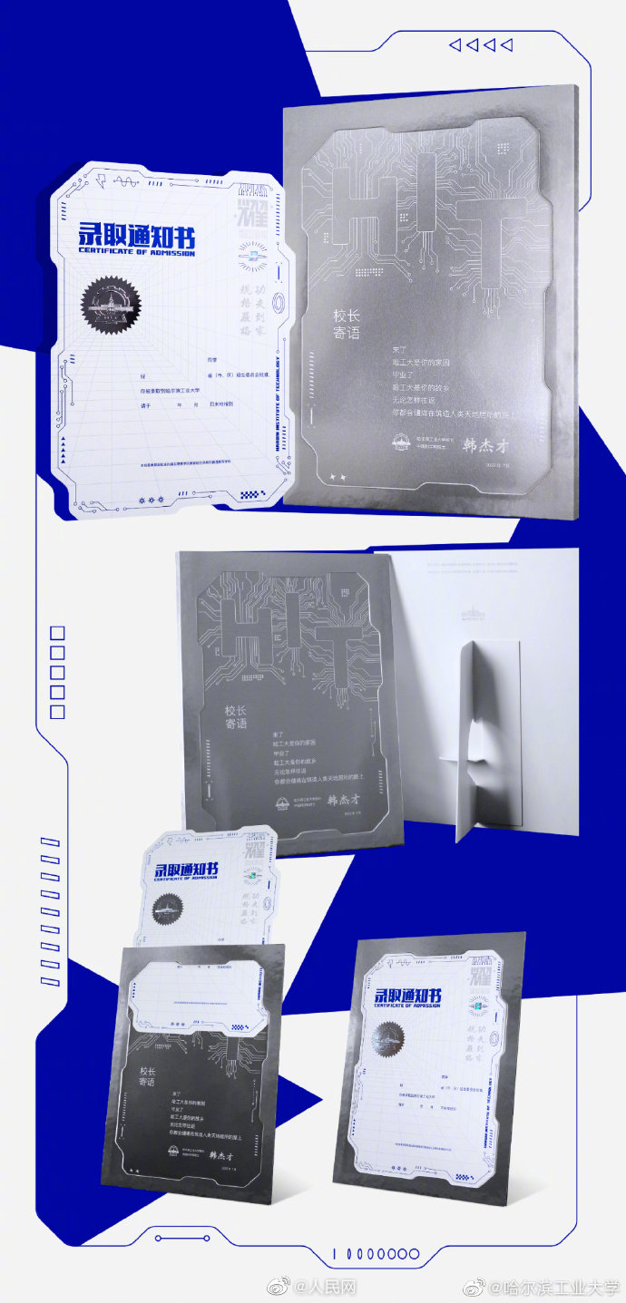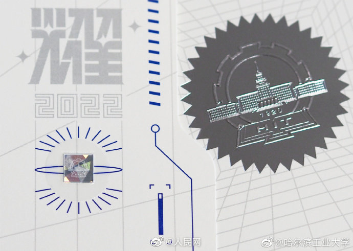 @哈尔滨工业大学 2022年的录取通知书外观酷似芯片主板,录取通知书的右侧,固封有该校自主研制的金刚石/蓝宝石。录取通知书的背面,也采用了特殊的制作工艺,当受到高热高亮的照射后,会呈现出夜光效果并显现出今年通知书的主题“耀”!