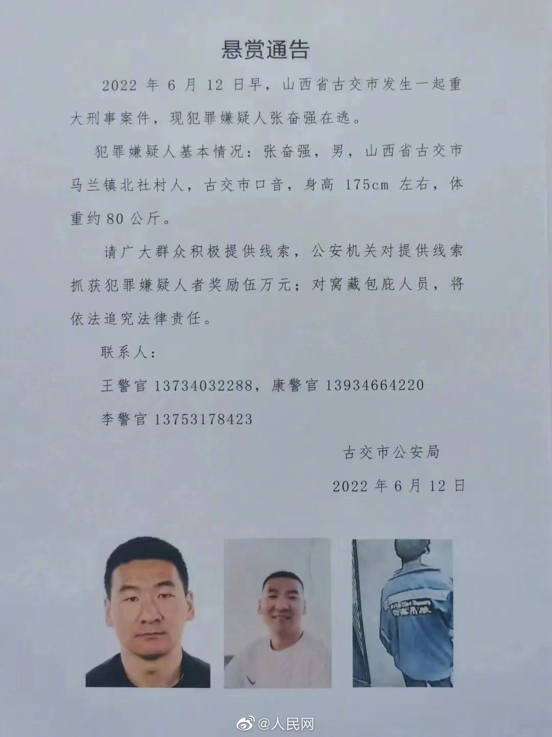 2022年6月12日早,山西省古交市发生一起重大刑事案件,现犯罪嫌疑人张奋强在逃。犯罪嫌疑人基本情况:张奋强,男,山西省古交市马兰镇北社村人,古交市口音,身高175cm左右,体重约80公斤。请广大群众积极提供线索,公安机关对提供线索抓获犯罪嫌疑人者奖励伍万元;对窝藏包庇人员,将依法追究法律责任。