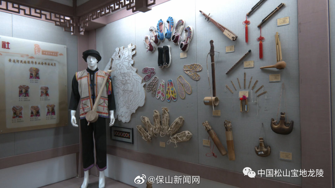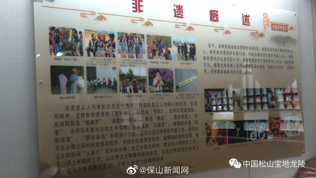 为了让更多的人认识非遗,走进非遗,同时为了展示沪滇合作项目成果,特建设了龙陵非遗展厅。龙陵既有傈僳族《篾葛调》、阿昌族《情歌》这样的灵魂放歌,也有阿昌族“蹬窝罗”、傈僳族“刮欠”、彝族香堂人“窝者”,这样与天地对话的生命演绎,还有傣族“马腿琴”、傈僳族乐器“睦呱唔滴”、“萨片麻姑”和彝族小三弦,这样从远古响来的天籁之音;更有如平达乡黄连河村的傈僳族服饰,象达镇的民间“人面竹”纸伞和木雕、龙江乡的群艺刺绣,镇安镇的土陶制作工艺,龙山镇的土布制作工艺,以及黄龙玉精雕等绝活绝技,这些文明进程的鲜活足迹,成为历史发展的见证,龙陵人创造力的精神源泉。