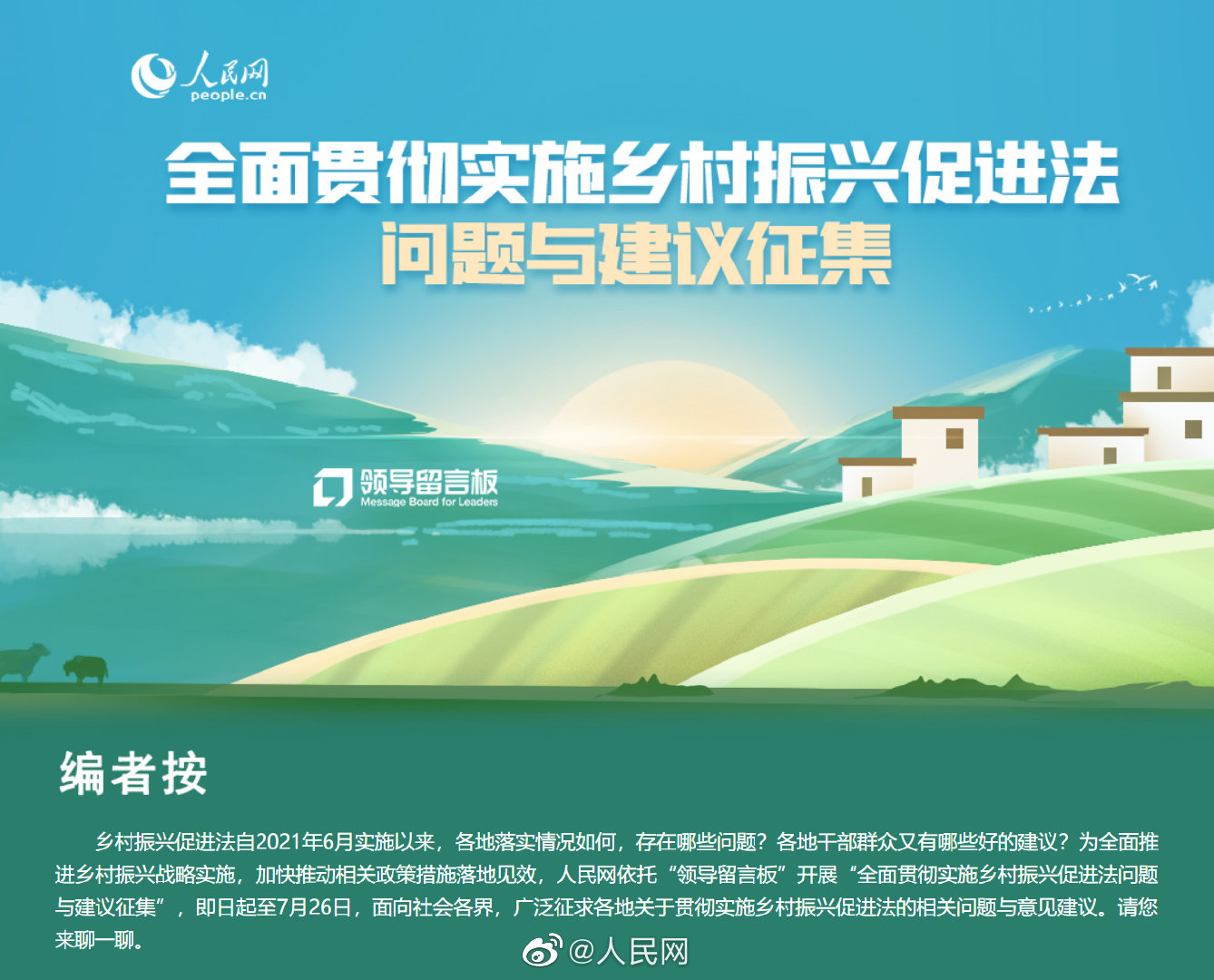 乡村振兴促进法自2021年6月实施以来,各地落实情况如何?存在哪些问题?为全面推进乡村振兴战略实施,加快推动相关政策措施落地见效,即日起至7月26日,人民网推出“全面贯彻实施乡村振兴促进法问题与建议征集”,您有哪些问题线索、意见建议,欢迎留言→