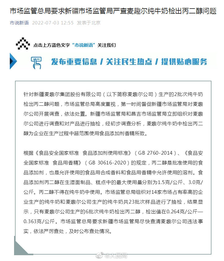 市场监管总局要求新疆市场监管局严查麦趣尔纯牛奶检出丙二醇问题