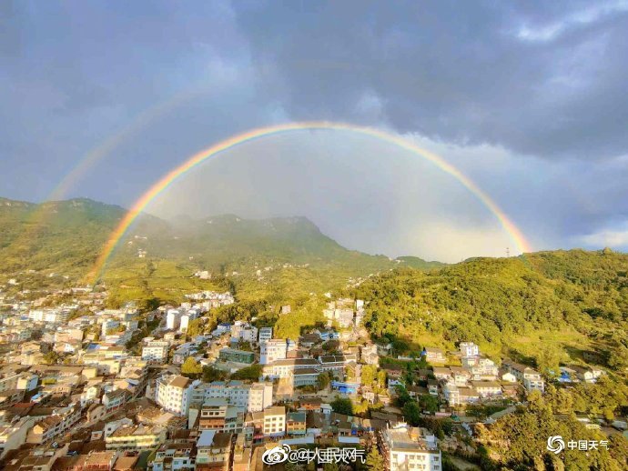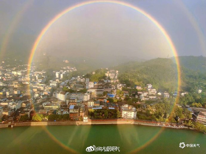 7月2日,贵州省石阡县出现双彩虹。通过航拍,在高度高的情况下,拍摄到了难得一见的彩虹圈,如梦似幻。据悉,其实#彩虹原本就是圆环形#,只不过平时我们站地面看,位置太低,另一半彩虹都被地面挡掉,只要站得够高就有机会看到更完整的圆环彩虹!#美好贵州#@中国天气