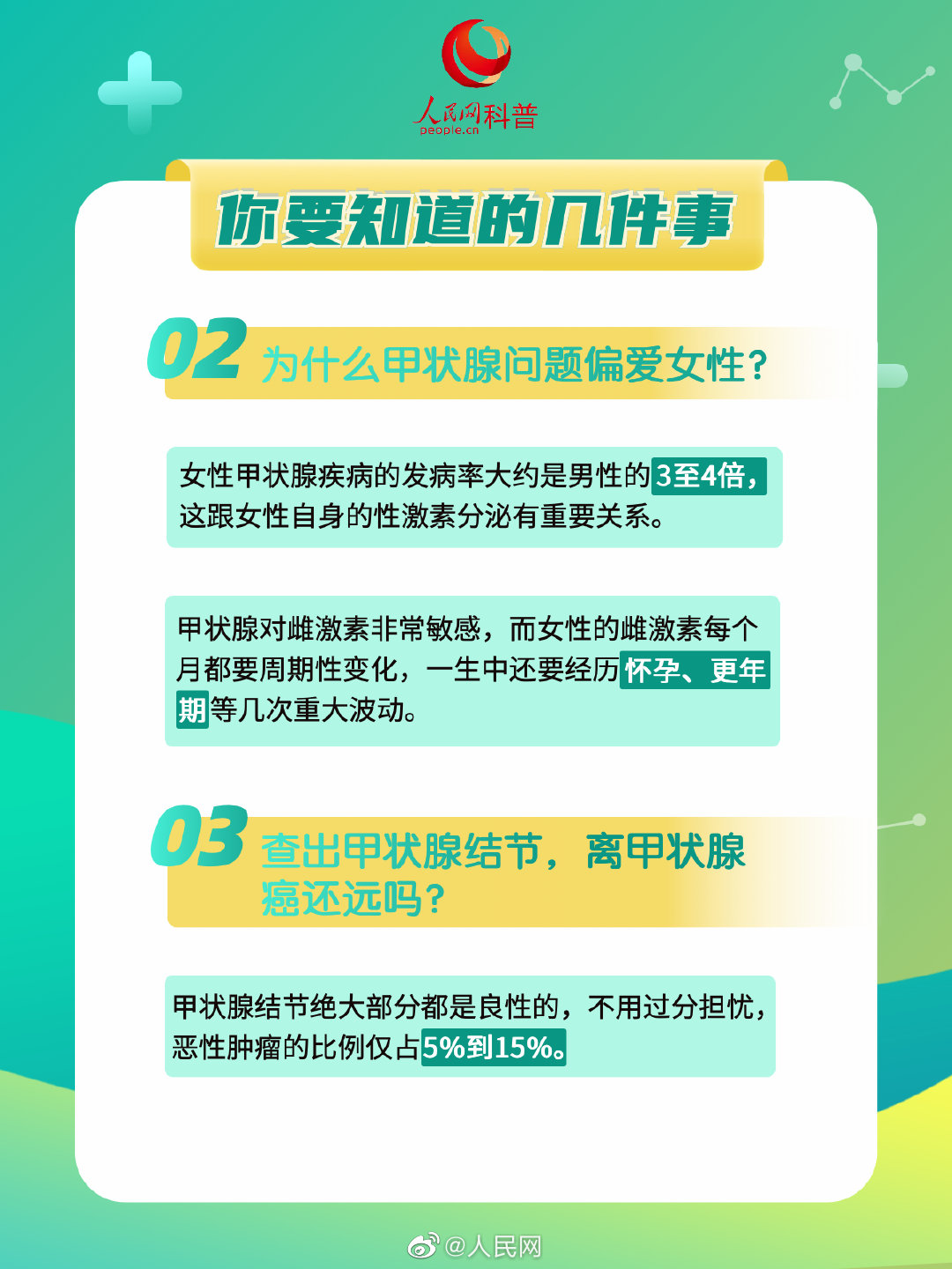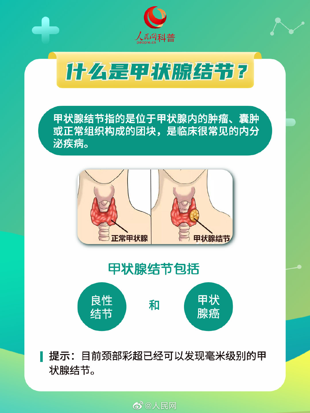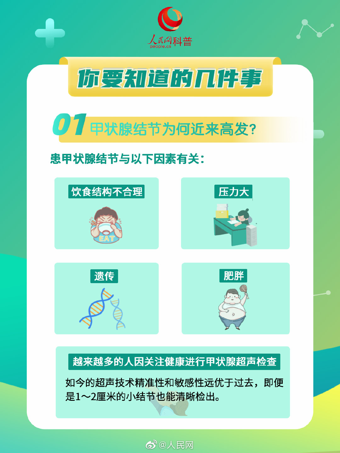 近年来,很多人的体检报告上都会出现同一个身影——甲状腺结节。数据显示,女性甲状腺发病率高于男性。发现甲状腺结节怎么办?引发甲状腺结节的因素有哪些?为健康,收藏备用!(人民网科普)