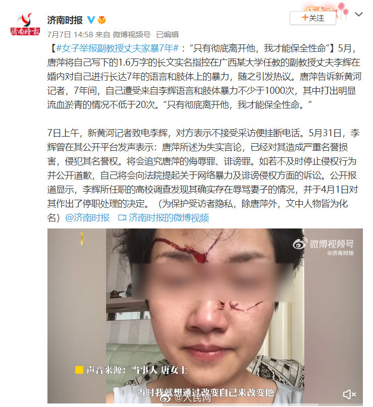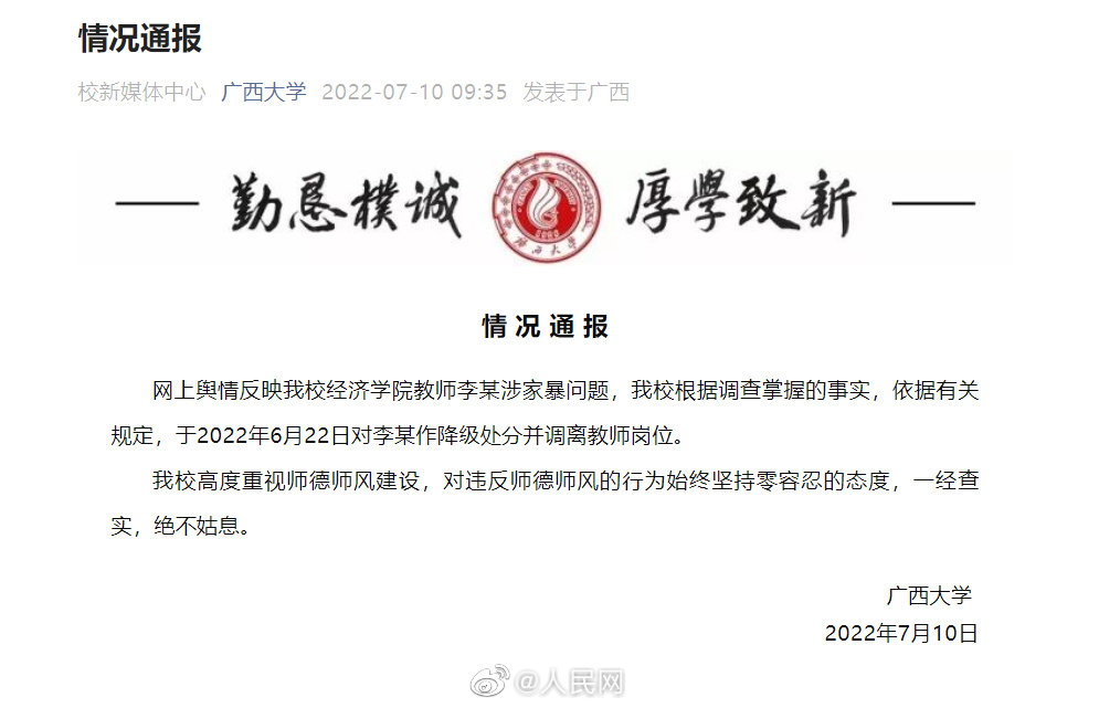 7月10日,针对#广西大学副教授家暴妻子7年#一事,广西大学发布通报:网上舆情反映我校经济学院教师李某涉家暴问题,我校根据调查掌握的事实,依据有关规定,于2022年6月22日对李某作降级处分并调离教师岗位。(人民网教育频道)