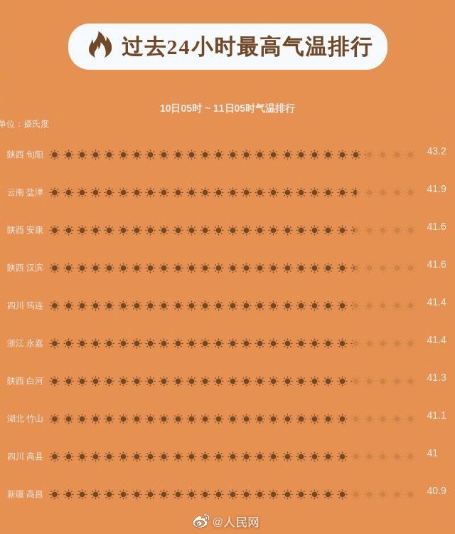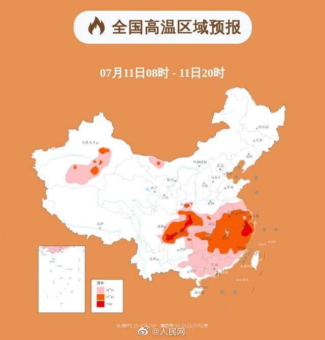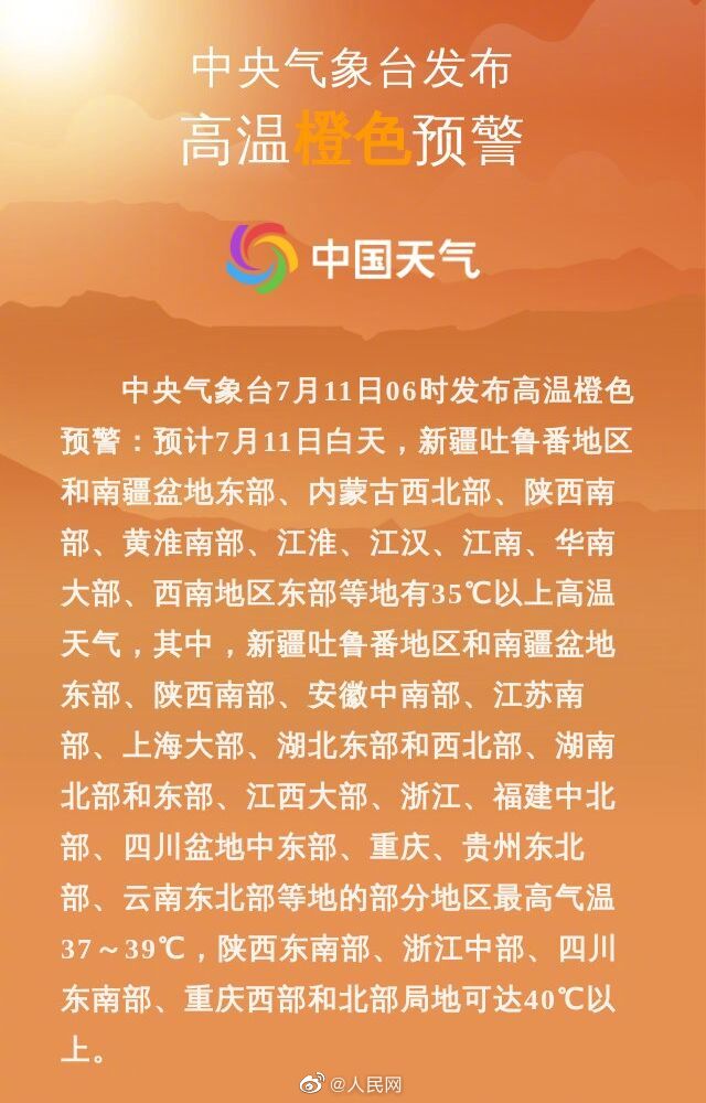 中央气象台7月11日06时发布高温橙色预警:预计7月11日白天,新疆吐鲁番地区和南疆盆地东部、内蒙古西北部、陕西南部、黄淮南部、江淮、江汉、江南、华南大部、西南地区东部等地有35℃以上高温天气,其中,新疆吐鲁番地区和南疆盆地东部、陕西南部、安徽中南部、江苏南部、上海大部、湖北东部和西北部、湖南北部和东部、江西大部、浙江、福建中北部、四川盆地中东部、重庆、贵州东北部、云南东北部等地的部分地区最高气温37~39℃,陕西东南部、浙江中部、四川东南部、重庆西部和北部局地可达40℃以上。@中国天气