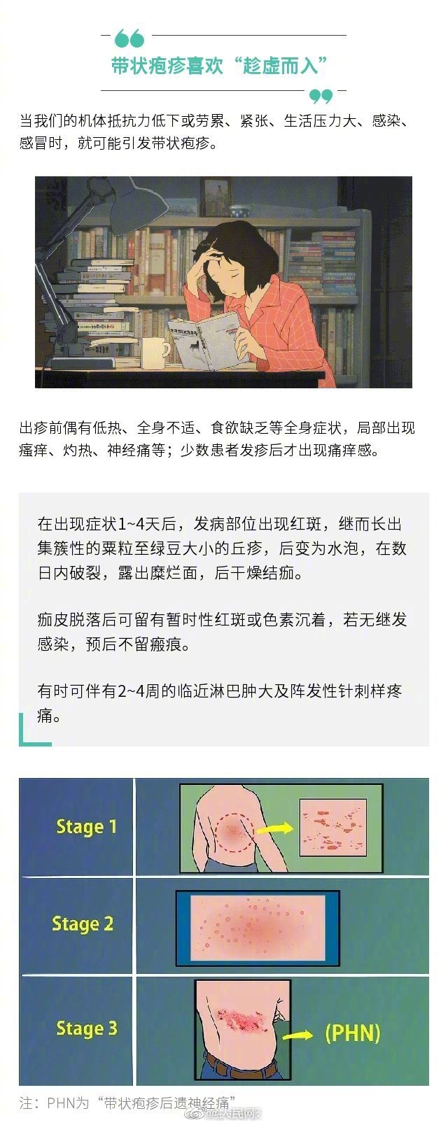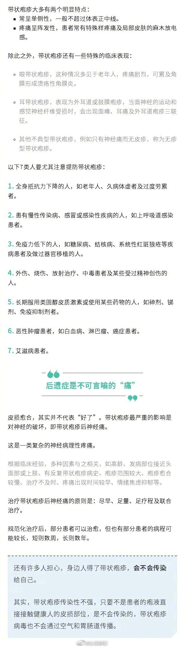 “带状疱疹会带来全身性的疼痛,疼到浑身打抖,持续了整整半个月。”带状疱疹,俗称“缠腰火丹”“缠腰蛇”,由“水痘-带状疱疹”的病毒感染引起。最新研究报告显示,#预计我国有1258万带状疱疹患者#,55岁及以上人群年均带状疱疹发病率最高,平均每1000人年发生10.13次带状疱疹。(人民日报健康客户端)