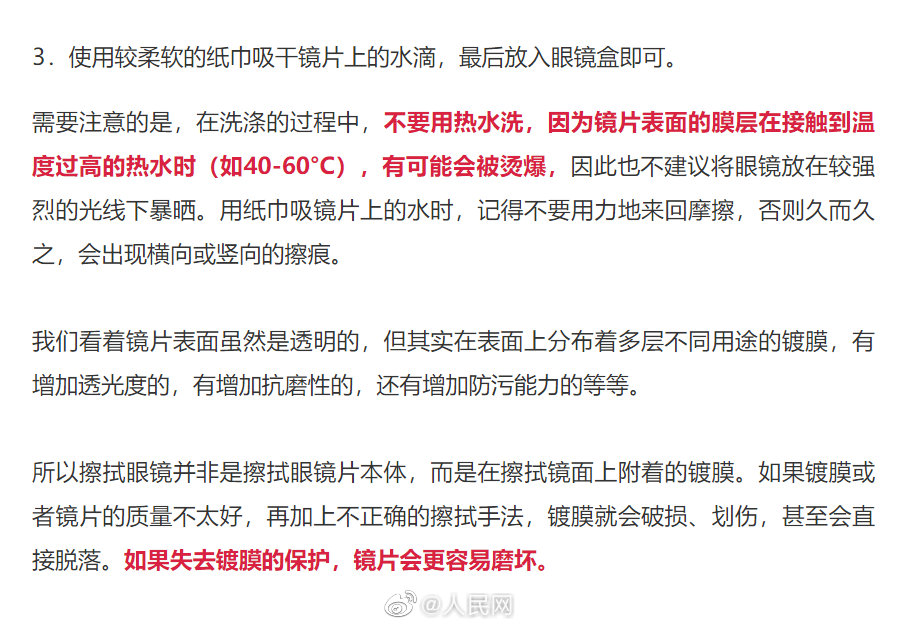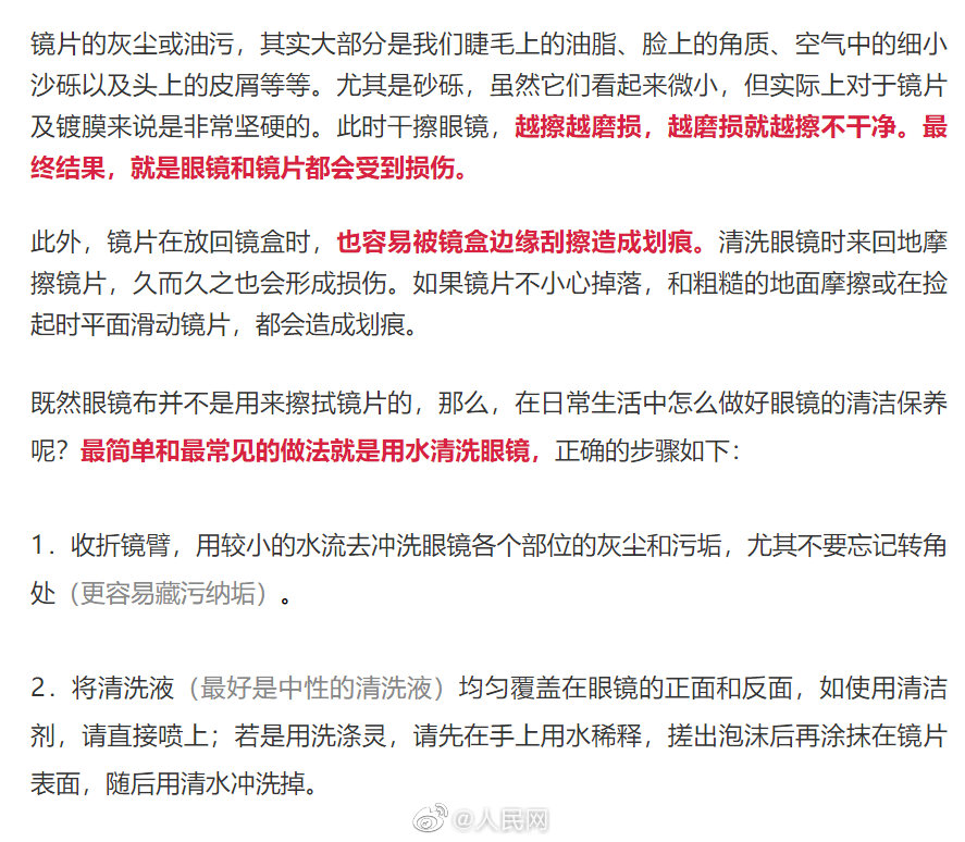 用眼镜布擦眼镜越擦越花,是因质量差还是日常操作有误?事实上,买眼镜送的那块布只是为保护眼镜,避免眼镜与盒发生磕碰。此外,市面上大部分眼镜布材质都不够细腻,且布上和镜片上易存留灰尘和细小异物,如果直接用眼镜布干擦,相当于用小颗粒摩擦镜片。清洁眼镜最简单和最常见的做法就是用水清洗。你多久清洁一次眼镜?@科普中国 (来源:数字北京科学中心)