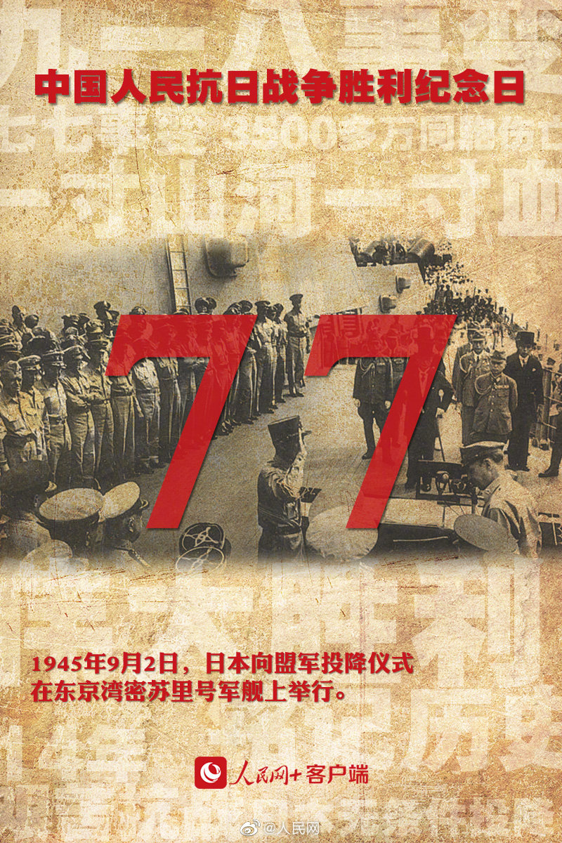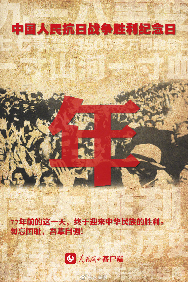 今天为3500万同胞发一条微博14年浴血奋战,3500多万同胞伤亡,一寸山河一寸血!77年前的这一天,终于迎来中华民族的胜利。今天#抗战胜利77周年纪念日#,勿忘历史,吾辈自强!