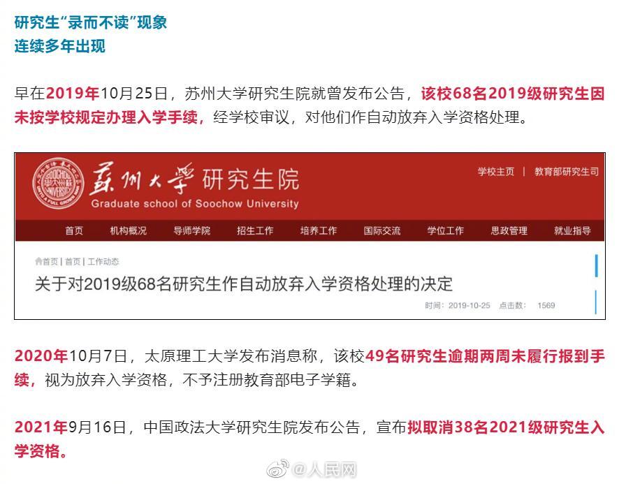 19日,@中国政法大学 研究生院发布公示,32名研究生放弃入学资格。据悉,研究生“录而不读”现象连续多年出现。有教授表示,“录而不读”原因诸多,虽然这种行为可以理解,但这种行为会危害到高校的招生秩序,并造成高校教育资源的浪费,应该引起重视。#如何看待研究生录而不读#?(中青报)