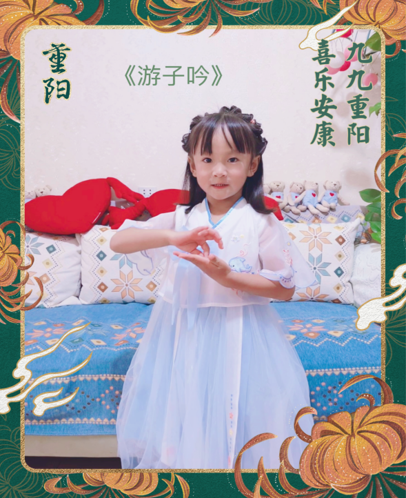 小朋友们身着传统服饰传诵出《游子吟》《九月九日忆山东兄弟》《采桑子·重阳》……精心地装扮和精美的视频制作体现出了家长们对于传统节日的重视;一首首重阳节的古诗,是孩子们对父母长辈辛苦付出的感恩,也是孩子们对于中华传统节日最直白的传诵。