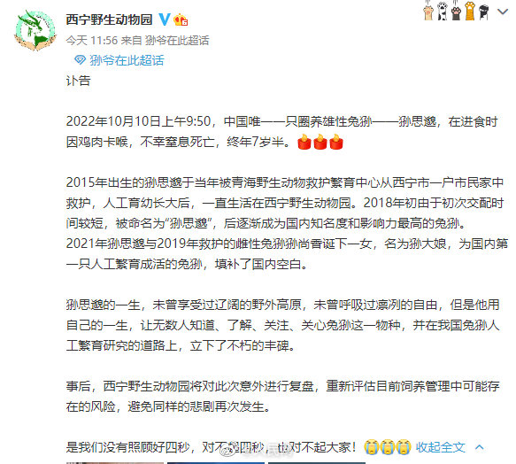 网红兔狲狲思邈死亡据@西宁野生动物园 ,10日上午9:50,中国唯一一只圈养雄性兔狲——狲思邈,在进食时因鸡肉卡喉,不幸窒息死亡,终年7岁半。2015年出生的狲思邈于当年被青海野生动物救护繁育中心从西宁市一户市民家中救护,人工育幼长大后,一直生活在西宁野生动物园,逐渐成为国内知名度和影响力最高的兔狲。2021年狲思邈与2019年救护的雌性兔狲狲尚香诞下一女,名为狲大娘,为国内第一只人工繁育成活的兔狲,填补了国内空白。