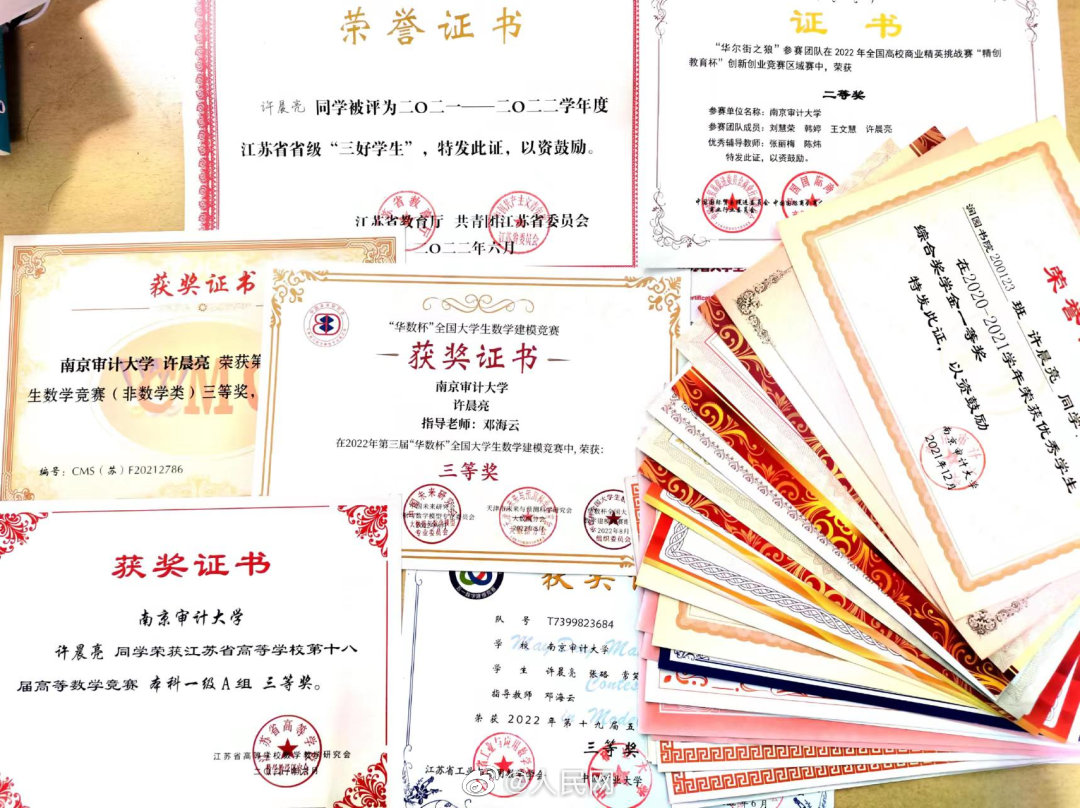 许晨亮是@南京审计大学 金融专业大三的学生。2021年,许晨亮顺利通过了学校的选拔,并在江苏省数学竞赛中获三等奖,之后他便对竞赛产生了兴趣。2021年5月至今年10月,许晨亮在各类数学建模比赛中斩获了7项国家级荣誉,8项省级荣誉。加油!#正青春 再出发# (人民网江苏频道)