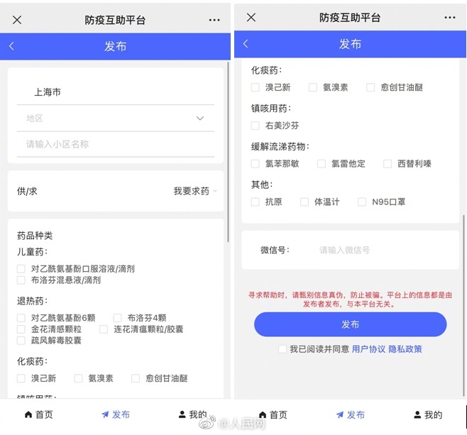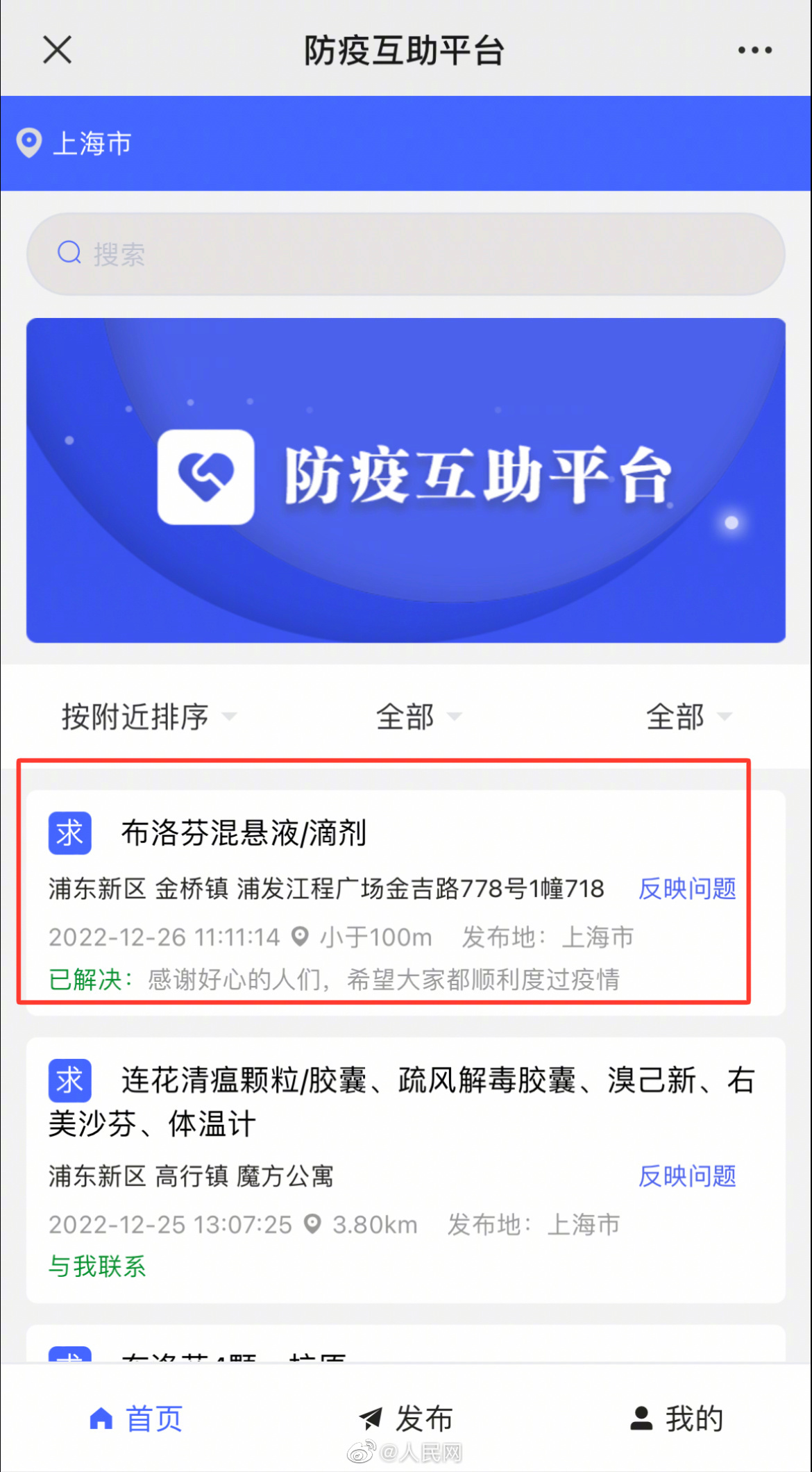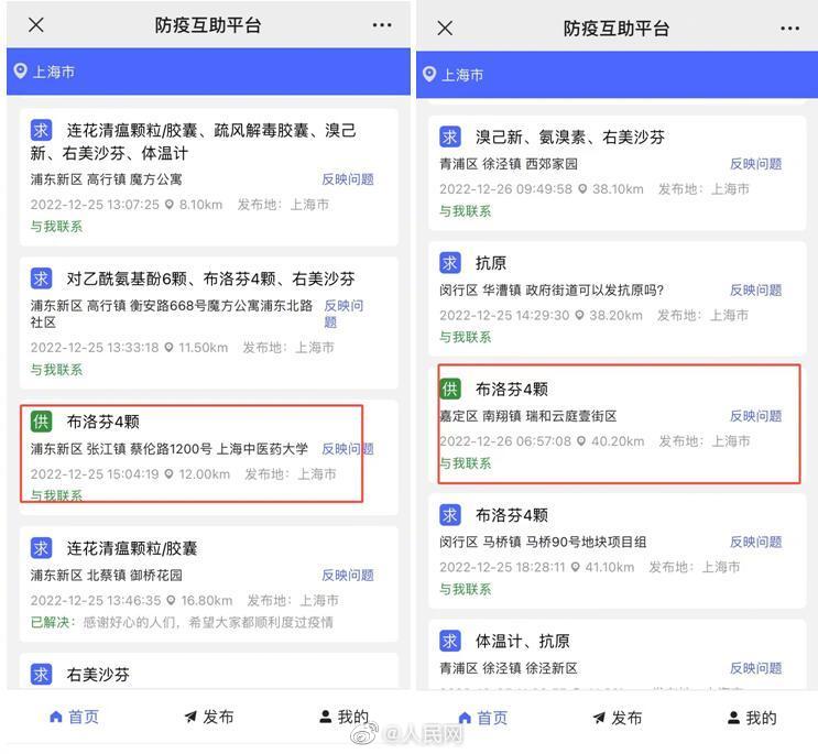 为缓解防疫药品物资局部紧缺,12月25日,“人民网+”客户端、人民好医生客户端试运行“#防疫互助平台#”(防疫互助平台),为群众提供近距离的药品及防护物资互助共享公益信息服务。平台上线时间不长,已有数条求助信息下方显示——已解决:感谢好心的人们!一场场在陌生人之间的互助接力,很暖!(人民日报中央厨房)