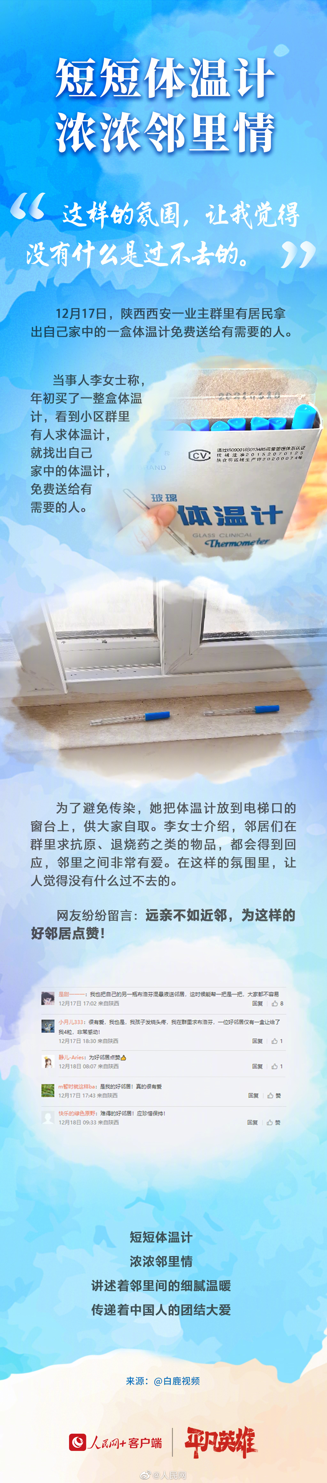 近日,西安,在看到邻居需要体温计后,李女士将自己年初买的一盒体温计拿出来,免费送给邻居。李女士介绍,邻里之间非常有爱。在这样的氛围里,让人觉得没有什么过不去的。关注由“人民网+”客户端、人民好医生客户端推出的#防疫互助平台#(防疫互助平台),近距离物资互助共享,让我们守望相助,共克难关。