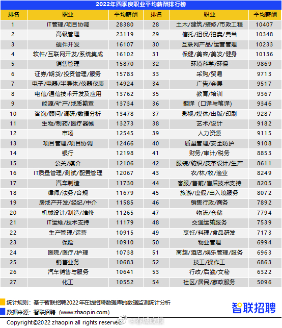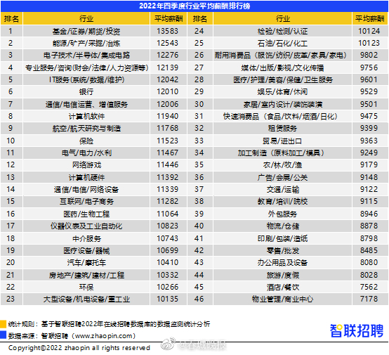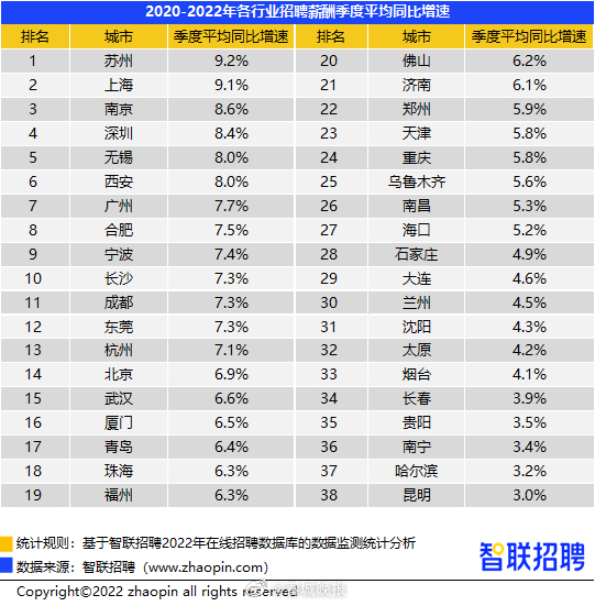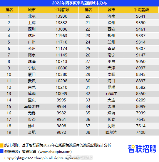 近日,智联招聘发布了2022年第四季度《中国企业招聘薪酬报告》,四季度全国平均招聘薪酬10558元/月,同比增速有所收窄,北上深广杭薪酬领跑,金融、IT互联网行业薪资高,旅游、酒店餐饮业处于低位。其中,昆明四季度平均招聘薪酬为8582元/月,平均增速达3.0%。报告显示,四季度北上深广杭薪酬水平仍领跑。北京以13930元招聘月薪位居榜首,上海(13832元)次之,深圳(13086元)、杭州(11963元)和广州(11710元)薪酬水平排名仍然保持前五。同时发现,在疫情持续和经济承压的三年中,长三角地区经济展现较强活力,带动薪资水平持续走高。此外,深圳、广州、东莞等珠三角城市以及西安、长沙、成都、北京的招聘薪酬增速也高于38个城市平均增速。(云南网)