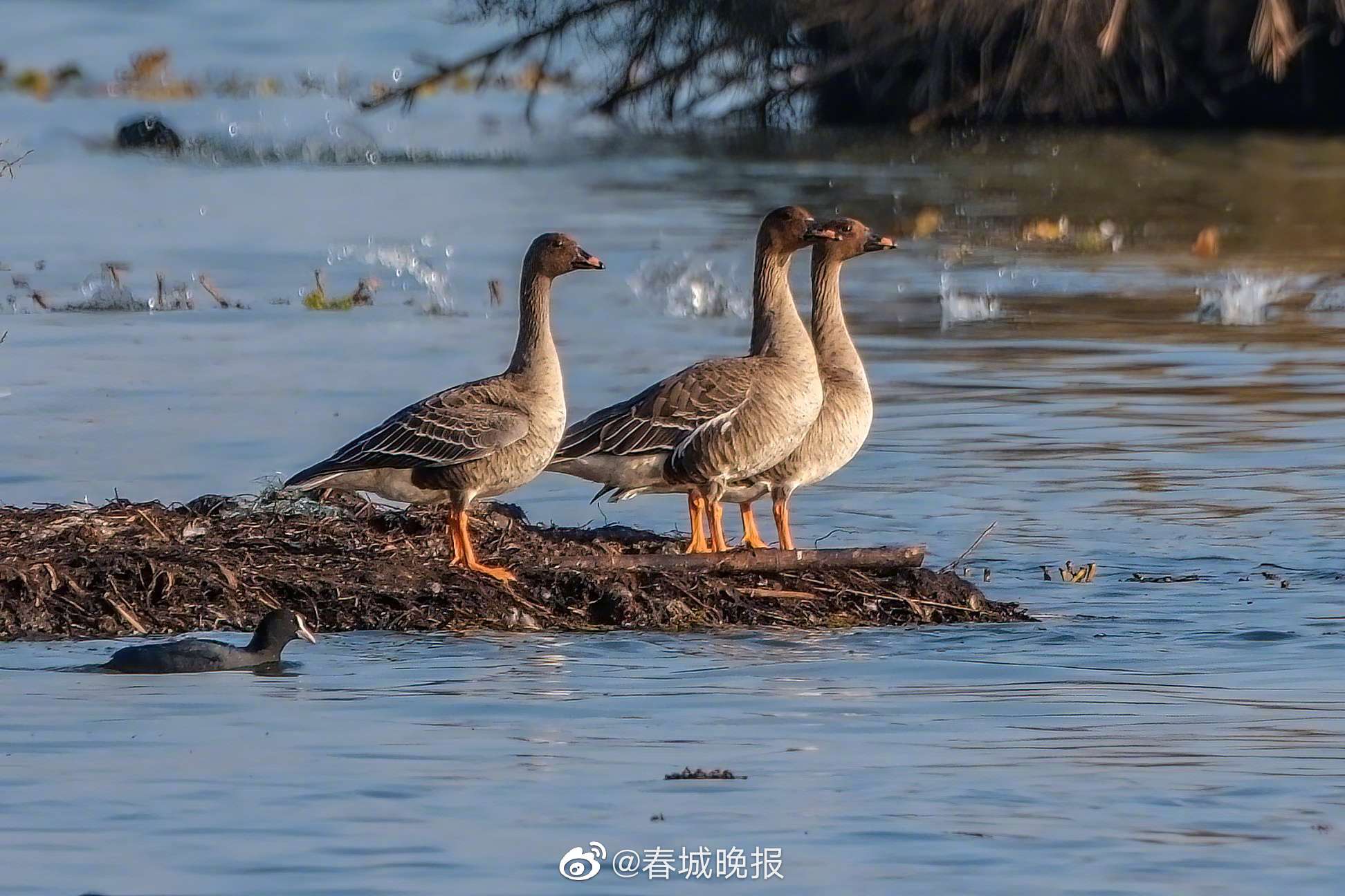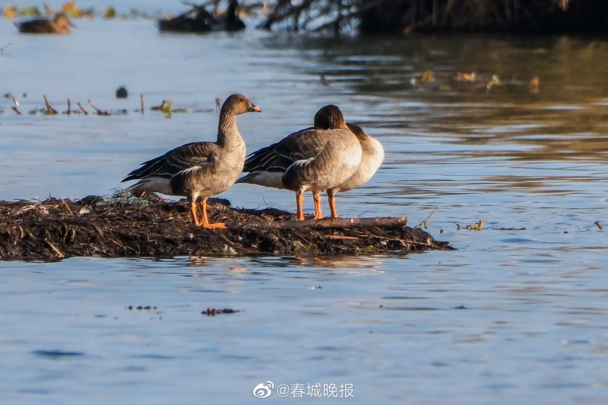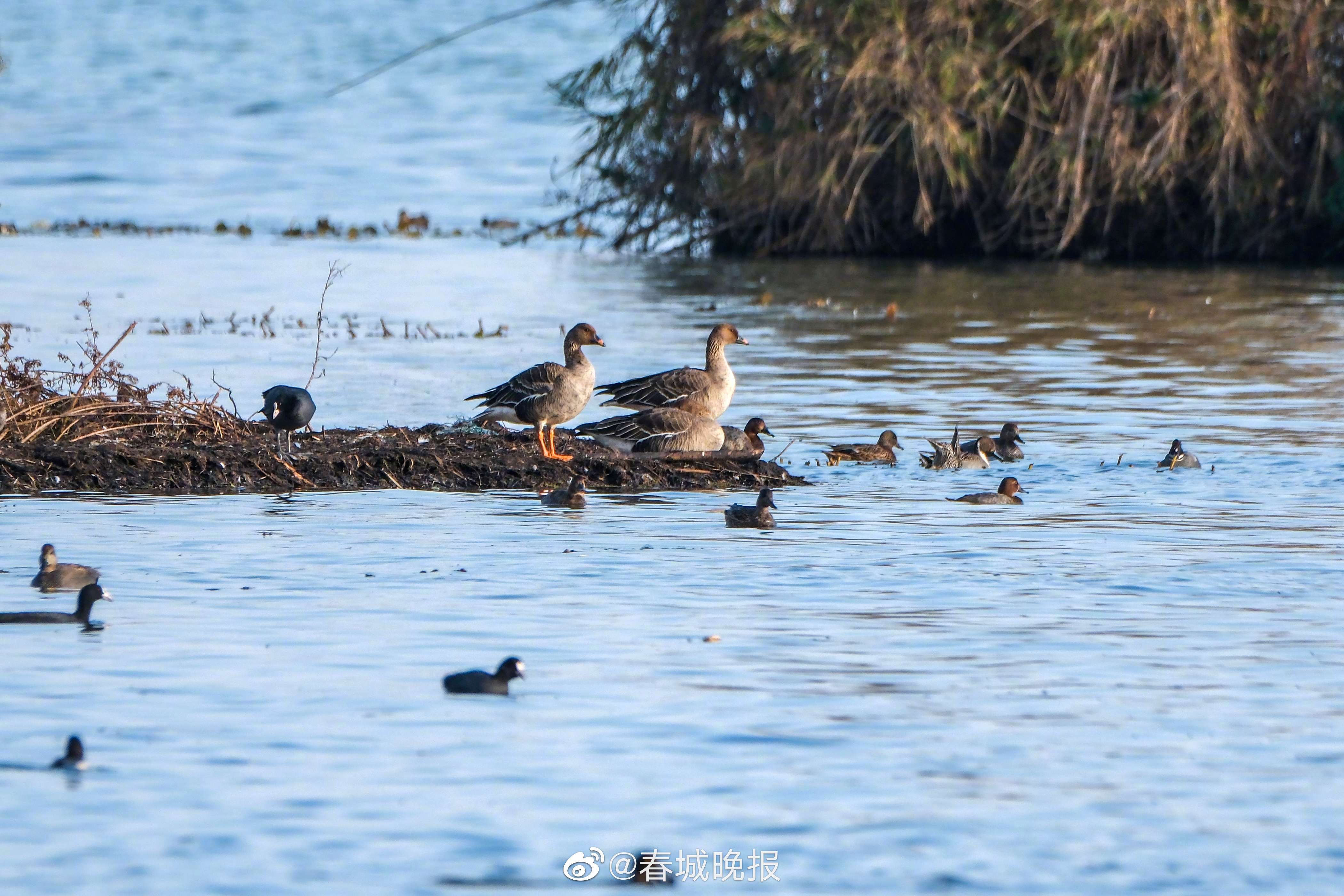 1月10日,中科院昆明动物研究所的伍和启博士在晋宁滇池一湿地调查越冬鸟类时,发现滇池鸟类新记录——两只国家二级保护鸟类白额雁和三只短嘴豆雁,这是2017年在滇池记录到灰雁后再次记录到雁类在滇池越冬。资料记载,短嘴豆雁形态特征大型游禽,体长69~80厘米。嘴黑色,前端有一橘黄色带斑。头和颈棕褐色,头部和颈背色略深。背和翼上覆羽深灰褐色,羽端白色,形成白色细横纹。飞羽灰褐色。胸淡棕色,至腹部色渐浅,两胁具有灰褐色横斑。尾上和尾下覆羽白色;尾羽黑褐色,末端白色。脚橙黄色。相较豆雁体型略小且颈较短,嘴较为短粗且嘴上黄色斑略大;头部形状似麻鸭类,而非豆雁的似天鹅类。是国家保护的有重要生态、科学、社会价值的陆生野生动物。白额雁是雁属中体形大,个体重的鸟类,是国家二级保护鸟类。体长64-80厘米,体重2-3.5千克,和豆雁大小差不多。上体大多灰褐色,从上嘴基部至额有一宽阔白斑,下体白色,杂有黑色块斑。飞行时双翼拍打用力,振翅频率高。脖子较长。腿位于身体的中心支点,行走自如。有扁平的喙,边缘锯齿状,有助于过滤食物。主要以植物性食物为食。觅食多在白天,有迁徙的习性,迁飞距离也较远。喜群居,飞行时成有序的队列,有一字形、人字形等。为一夫一妻制,雌雄共同参与雏鸟的的养育。(人民日报)
