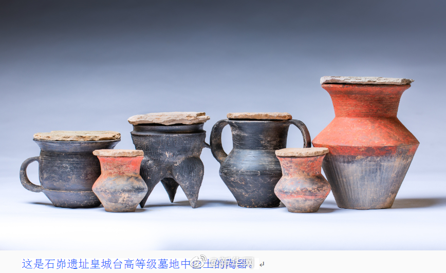 1月12日,2022年度陕西重要考古发现新闻发布会在西安举行。陕西省考古研究院研究馆员邵晶在新闻发布会上介绍了石峁遗址的最新考古发现。这次发现的墓地由一道宽约4米的石墙与皇城台核心建筑分布区隔开。15座竖穴土坑墓可分为南北两区,其中南区墓葬等级更高,平面为圆角长方形,墓室面积普遍超过10平方米,深3.5米至4米。墓葬普遍使用木质棺椁,由榫卯套接而成,已朽为灰痕,墓内普遍殉人。因遭严重盗扰,墓主葬式不详、壁龛中多数器物已被盗。个别墓葬内壁龛未遭破坏,出土有整套完整陶器,器表施红色彩绘。在个别墓葬棺内及盗洞中发现有少量玉器及残片,可辨识的有钺、凿、环等。