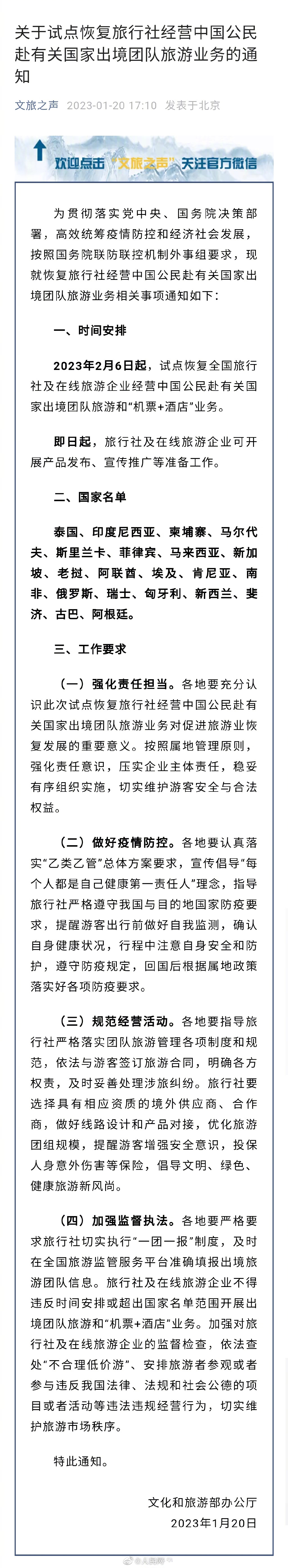 文化和旅游部办公厅1月20日发布《关于试点恢复旅行社经营中国公民赴有关国家出境团队旅游业务的通知》:2023年2月6日起,试点恢复全国旅行社及在线旅游企业经营中国公民赴有关国家出境团队旅游和“机票+酒店”业务。即日起,旅行社及在线旅游企业可开展产品发布、宣传推广等准备工作。(文旅之声)