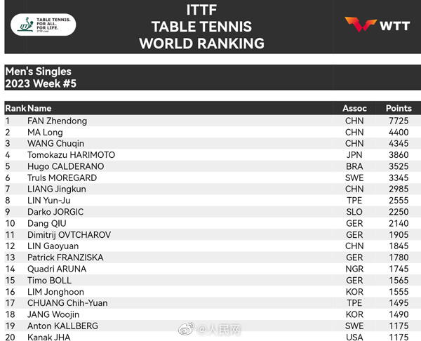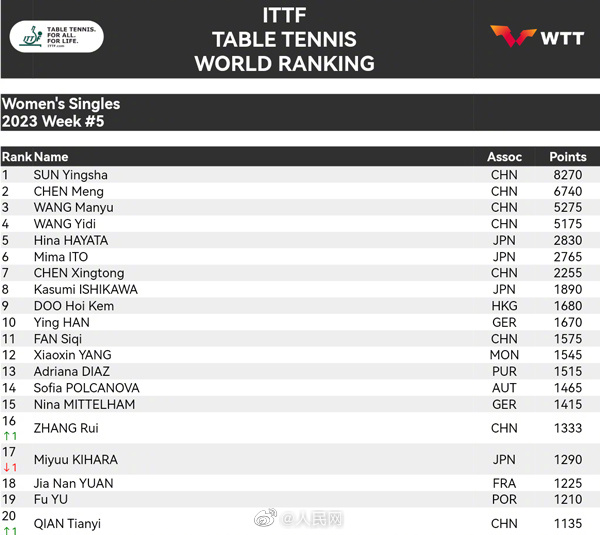 孙颖莎包揽3项世界第一1月31日,国际乒联公布了今年第五周的世界排名。中国选手在男单、女单、女双、混双四个项目上领跑积分榜。男单排名中,樊振东、@captain龙 、@王楚钦___ 包揽前三。女单排名中,@孙颖莎 、@陈梦-乒乓球 、@王曼昱 、王艺迪@迪214 分列前四。女双排名中,孙颖莎/王曼昱继续排名榜首。混双排名中,王楚钦/孙颖莎稳居榜首。(人民网记者李乃妍)