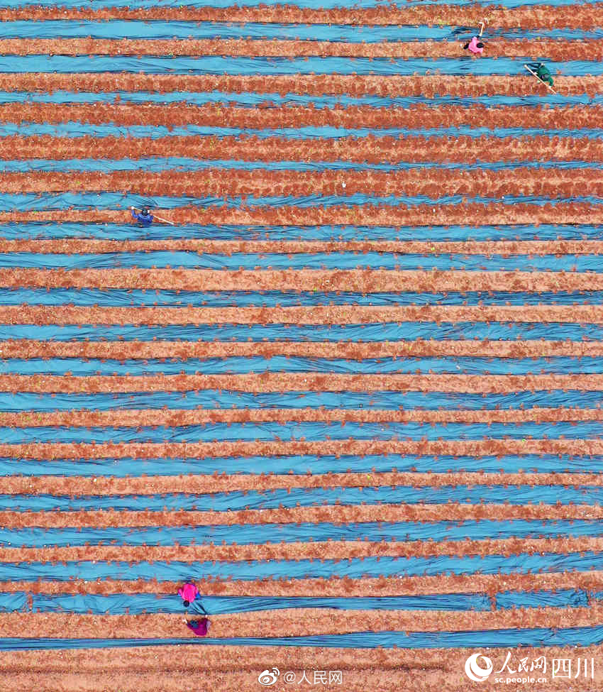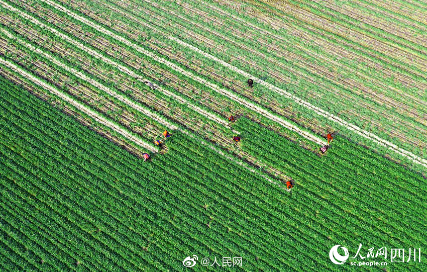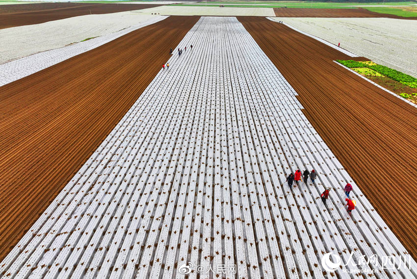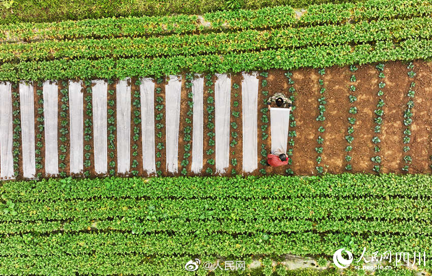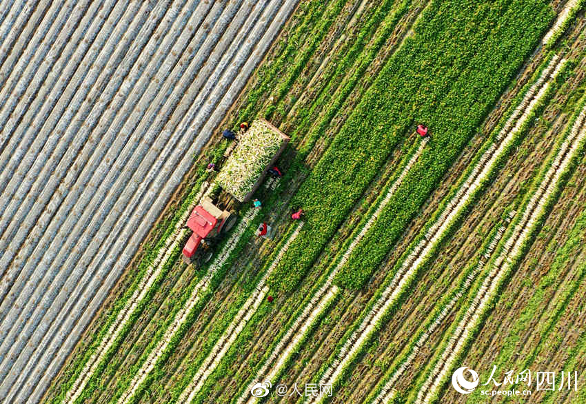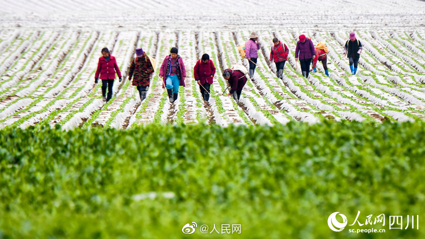 近日,四川南充中坝社区蔬菜种植基地里,连片的翠绿色蔬菜和白色地膜格外引人注目。连日来,种植基地内一派繁忙的景象,机器在翻整田地,村民们则忙着垒沟、浇水、放苗、盖土和采收萝卜。#奋进的春天#(人民网四川频道)
