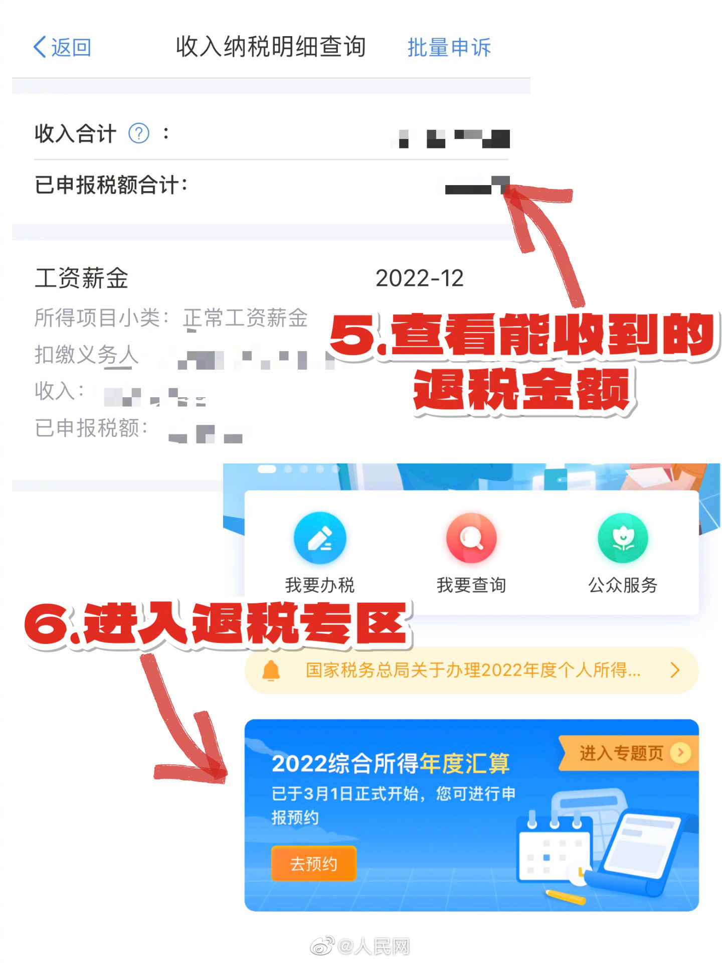2022年度个税汇算3月1日起开始。纳税人如需在3月1日至3月20日之间办理年度汇算,可在2月16日至3月20日每天的早6点至晚22点登录手机个人所得税APP进行预约。2022年度退补税怎么办理?手把手教你,详戳↓↓