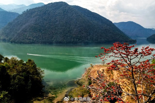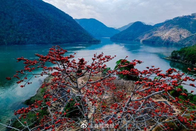 近日,澜沧江畔的大理州南涧县公郎镇,木棉花在枝头次第开放,木棉花绚丽的火红色与碧绿的澜沧江水,以及往来船只构成一幅美丽的春日山水画卷。(春城晚报-开屏新闻记者 刘文波 杨维绮 杨茜 通讯员 适志宏 摄影报道)