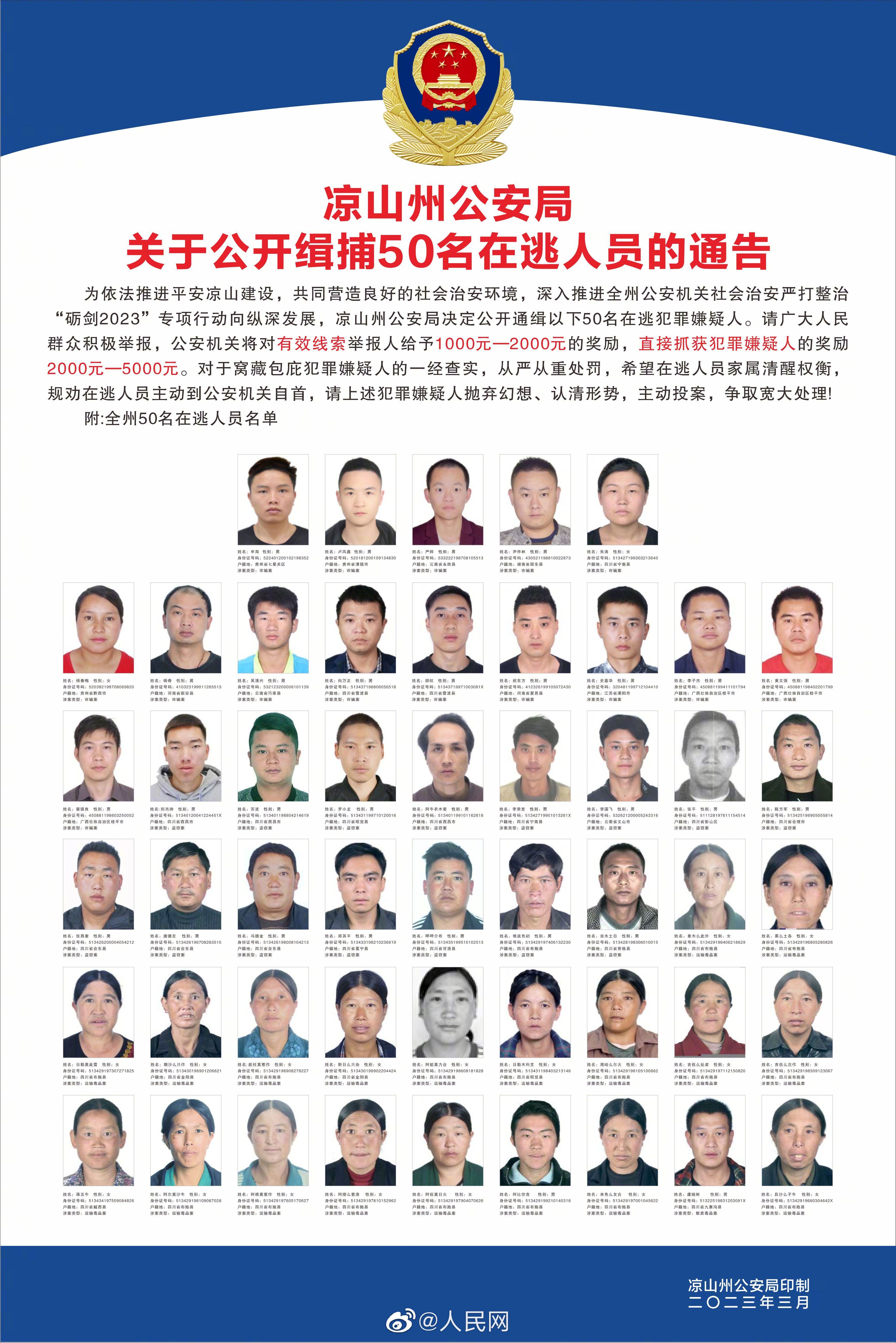 凉山州公安局关于公开缉捕50名在逃人员的通告