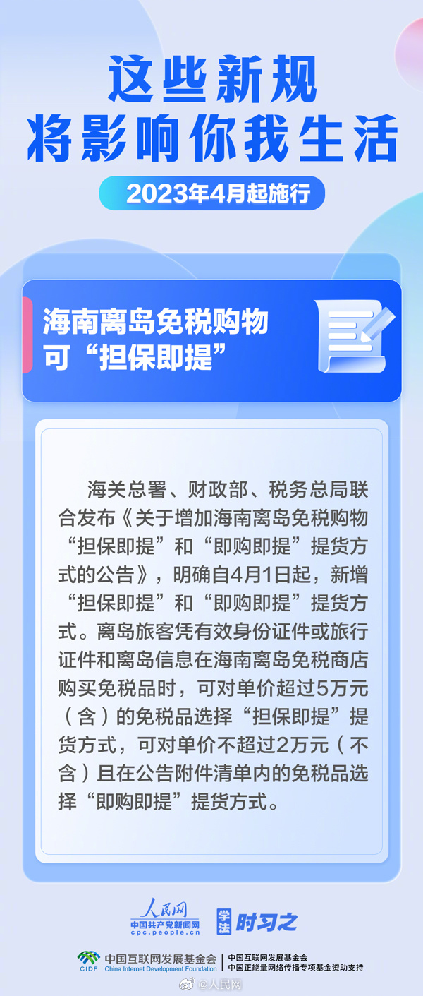 ①#4月起海南离岛免税购物可担保即提#“即购即提”;②启用第七版出生医学证明;③普通话水平测试取消备测时间…#4月新规#,将影响你我生活 ↓↓(人民网 薄晨棣 温璐)
