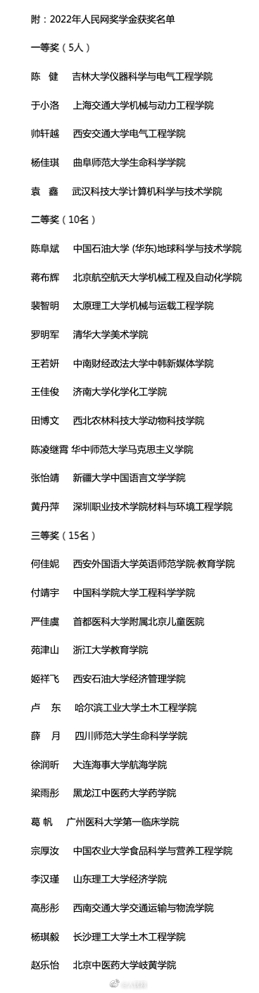 3月30日,2022人民网奖学金获奖名单公布并举行颁奖典礼。@吉林大学 陈健、@上海交通大学 于小洛、@西安交通大学 帅轩越、@曲阜师范大学 杨佳琪、@武汉科技大学 袁鑫获得一等奖,奖金2万元;还有10名同学获得二等奖,15名同学获得三等奖。恭喜!