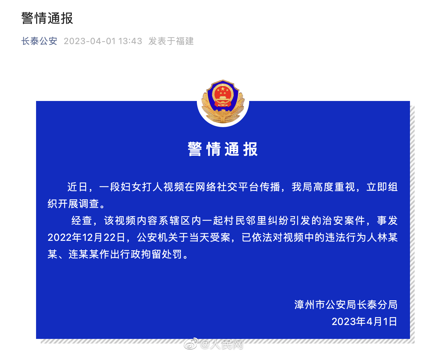 福建漳州市公安局长泰分局通报:近日,一段妇女打人视频在网络社交平台传播。经查,该视频内容系辖区内一起村民邻里纠纷引发的治安案件,事发2022年12月22日,公安机关于当天受案,已依法对视频中的违法行为人林某某、连某某作出行政拘留处罚。#福建漳州老人#