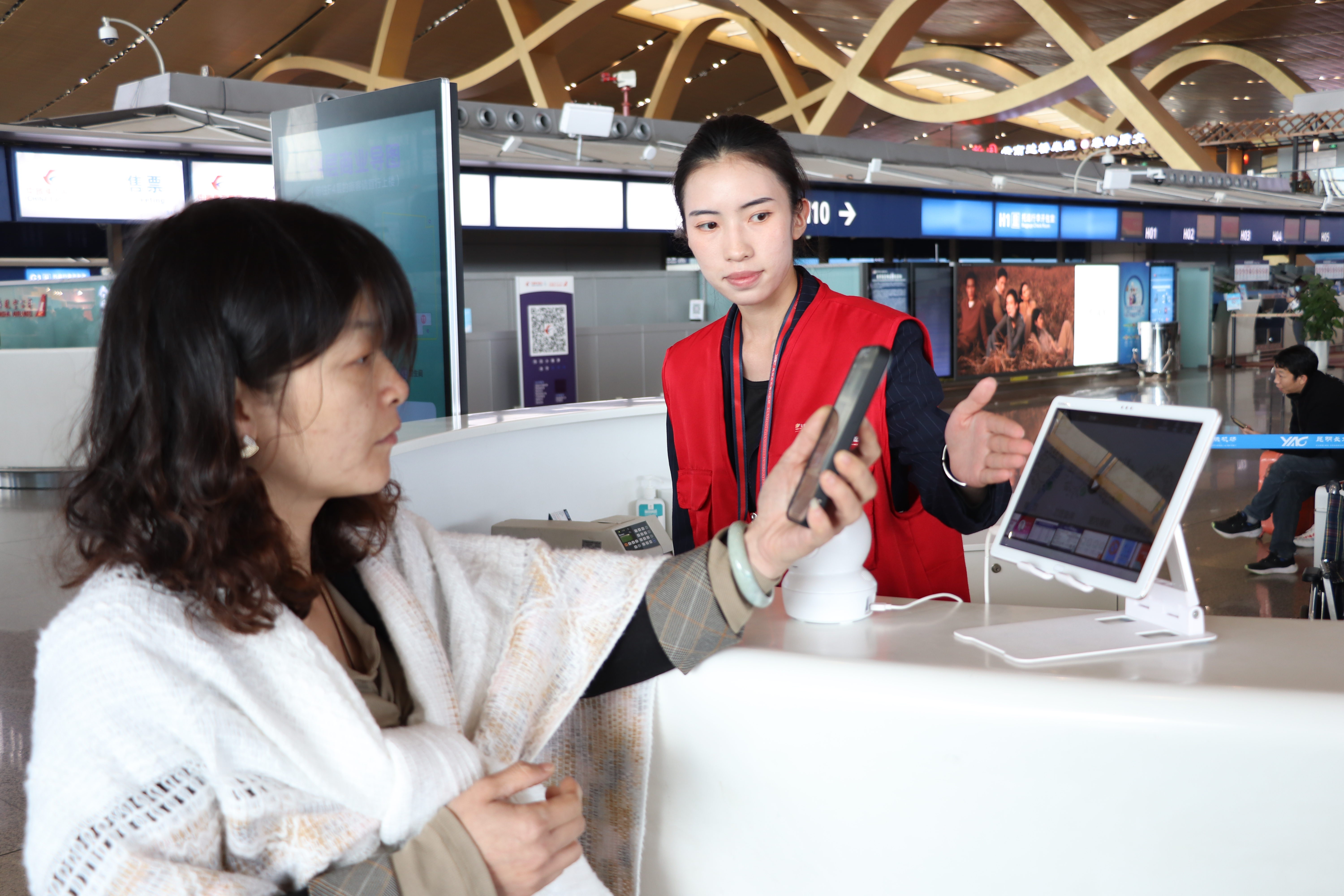2月14日大年初五20:00左右,志愿者赵莎换岗准备去吃饭休息,在安检入口附近遇到一家人正在送别一位老人,“老人的家人看起来十分不舍,情绪激动,现场反复嘱咐老人过了安检要怎么做、千万不要找错登机口、要确定标牌的数字和登机牌上数字一样之类的话语,我猜老人应该是不识字,并且第一次坐飞机”,于是赵莎主动上前出示证件表明身份,称愿意护送老人前往登机口。但老人的家人防范心较强,担心遇到骗子,经再三确认并拍下赵莎的证件后,才同意让她护送老人。到达登机口后,赵莎用手机给老人的家人拨打了电话,并让双方进行了通话。其家人非常感激赵莎提供的主动帮扶,并为之前误会她表达了歉意,称赞昆明机场的志愿者有责任有担当。