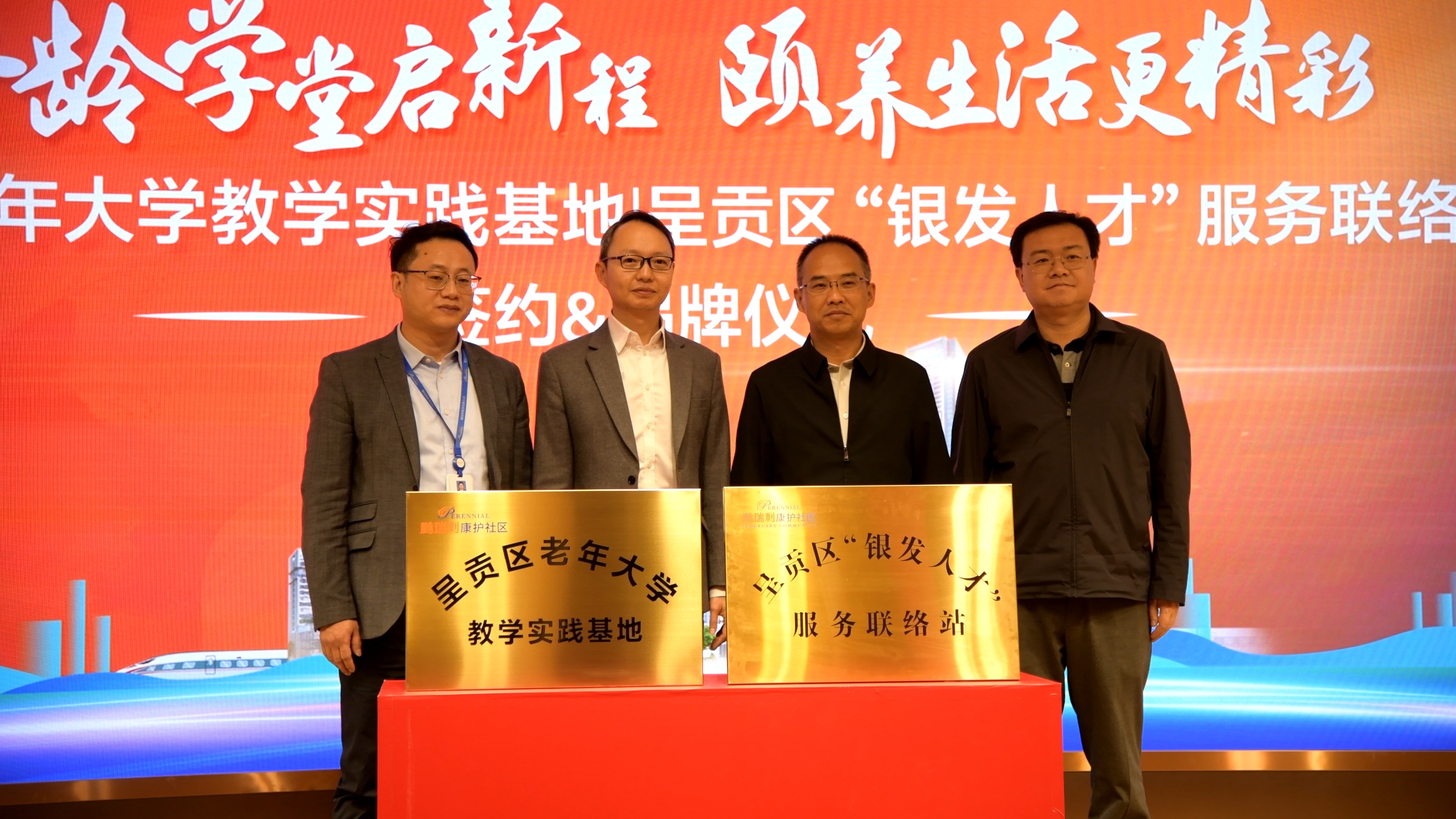 昆明信息港讯 3月28日,昆明鹏瑞利康护社区迎来具有里程碑意义的时刻——呈贡区老年大学教学实践基地与“银发人才”服务联络站双平台正式签约及揭牌。作为呈贡区应对老龄化战略的创新实践,此次政企合作在鹏瑞利打造的“银龄服务综合体”,将教育赋能与人才开发深度融合,开启“老有所学、老有所为”的银龄生活新范式。呈贡区委书记陈净、副书记何松、呈贡区组织部副部长王佳、昆明南站鹏瑞利国际健康商旅城总经理陈志豪、鹏瑞利集团中国区养老总经理张抗抗出席签约及揭牌仪式。